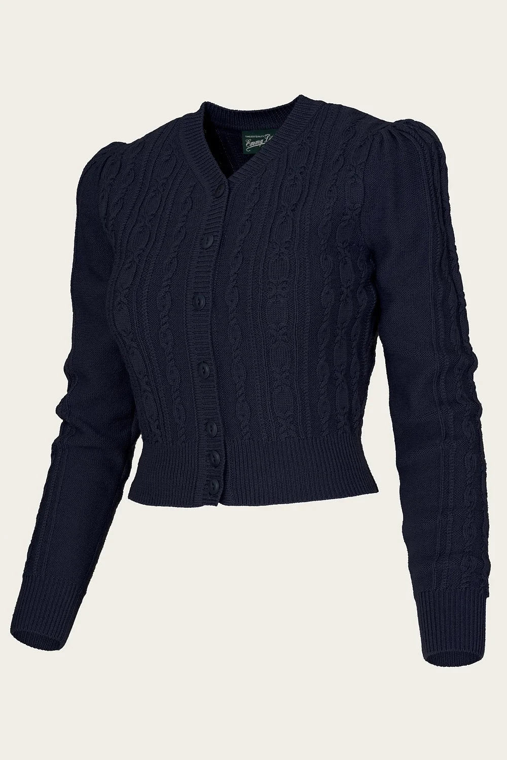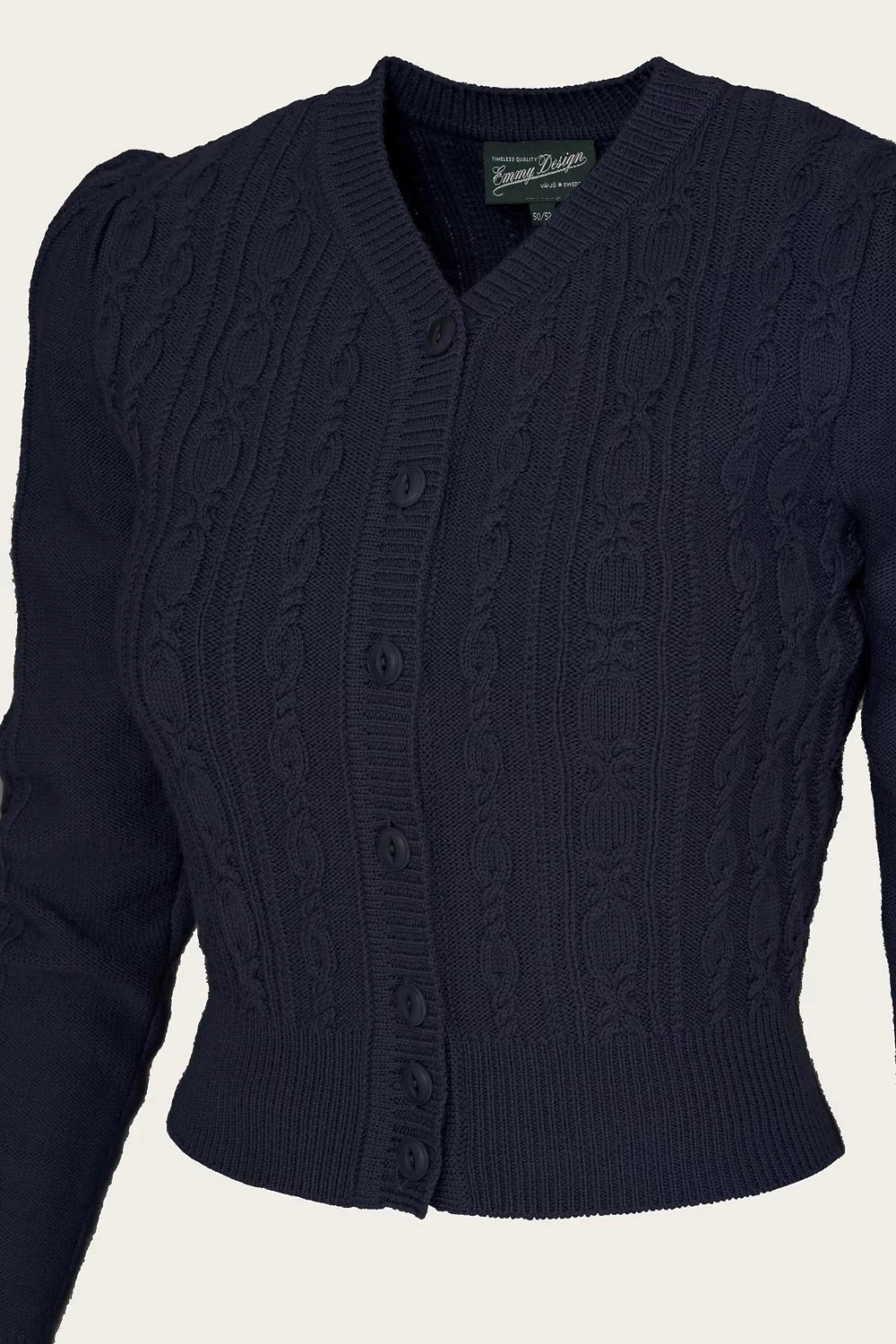 Ice Skater-cardiganen är en favorit som ingen bör vara utan. Flatterande flätstickning, puff vid axlarna och hög halsringning ger den rätta vintagekänslan. Den avslutas i midjan och sitter nära kroppen, vilket gör den perfekt till alla dina feminina retro- och vintageinspirerade outfits med fokus på midja och timglasfigur!