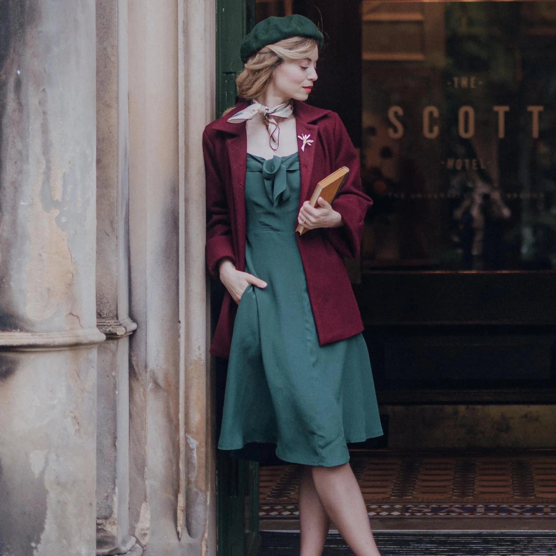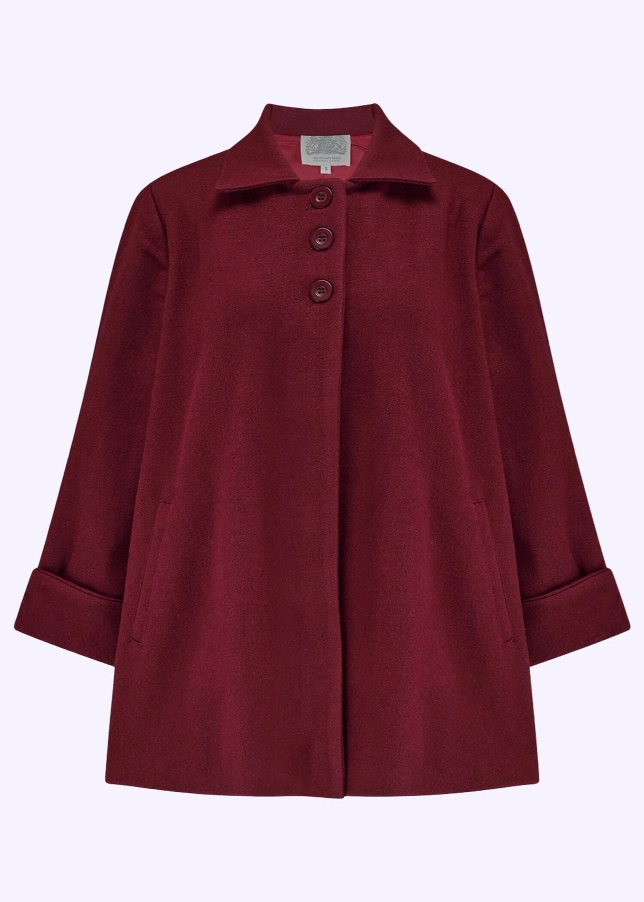 Ärmarna är vida och slutar i en klassisk uppvikning. De små axelvaddar gör att kappan sitter fint över axlarna och ger kappan en riktig 40-talslook. Rocken har en A-linje i vintage-stil som faller vackert och elegant runt kroppen.