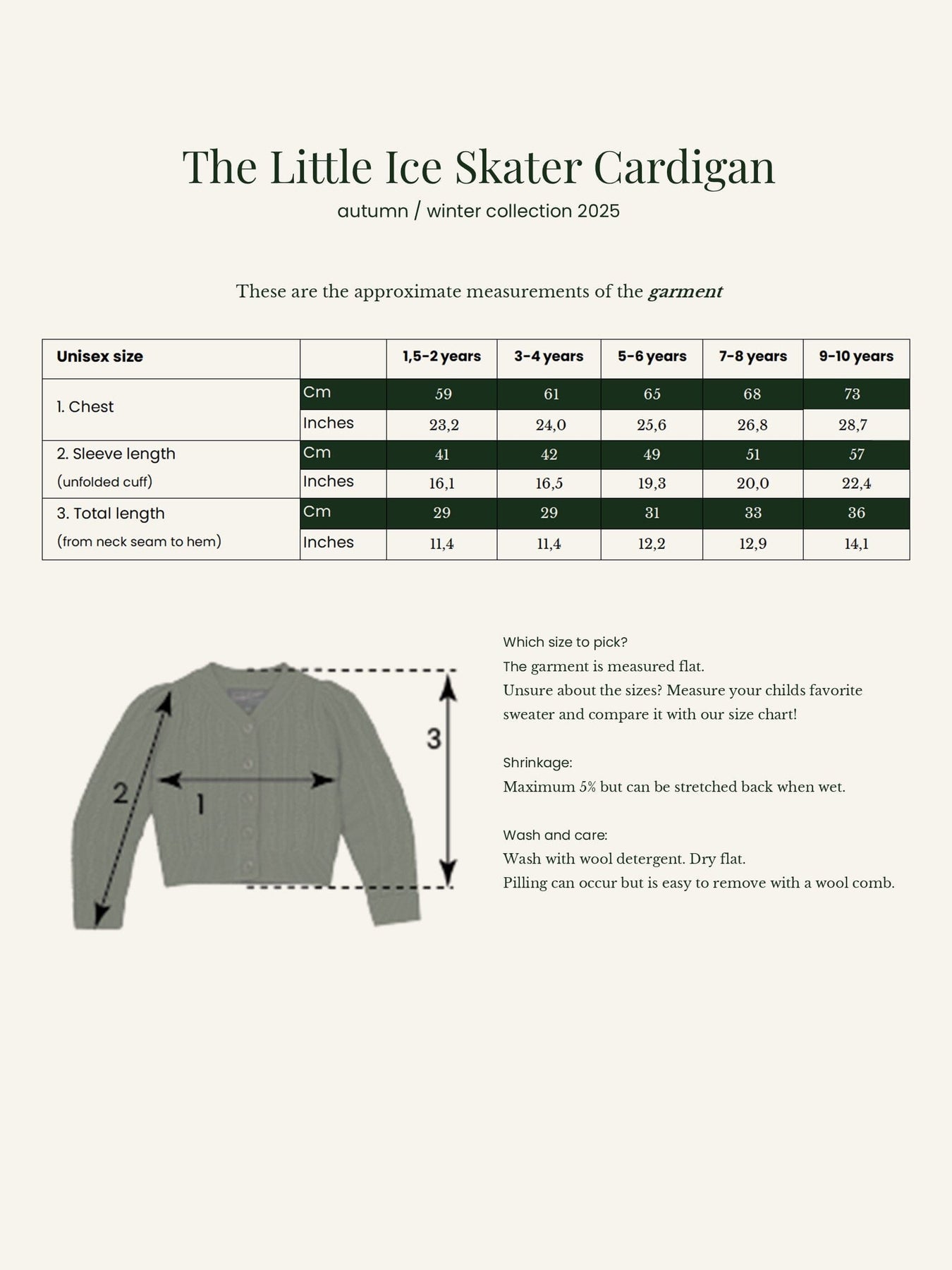 Emmys kunder har efterfrågat den i många år, och äntligen är den här! Ice Skater-koftan som ingen borde vara utan – inte heller de små. Här finns de välkända flätmönstren, puffärmarna vid axlarna och den höga halsknäppningen som ger den rätta vintagekänslan. Koftan är något längre och inte lika figurnära som vuxenvarianten, vilket gör den superbekväm för lek utomhus.