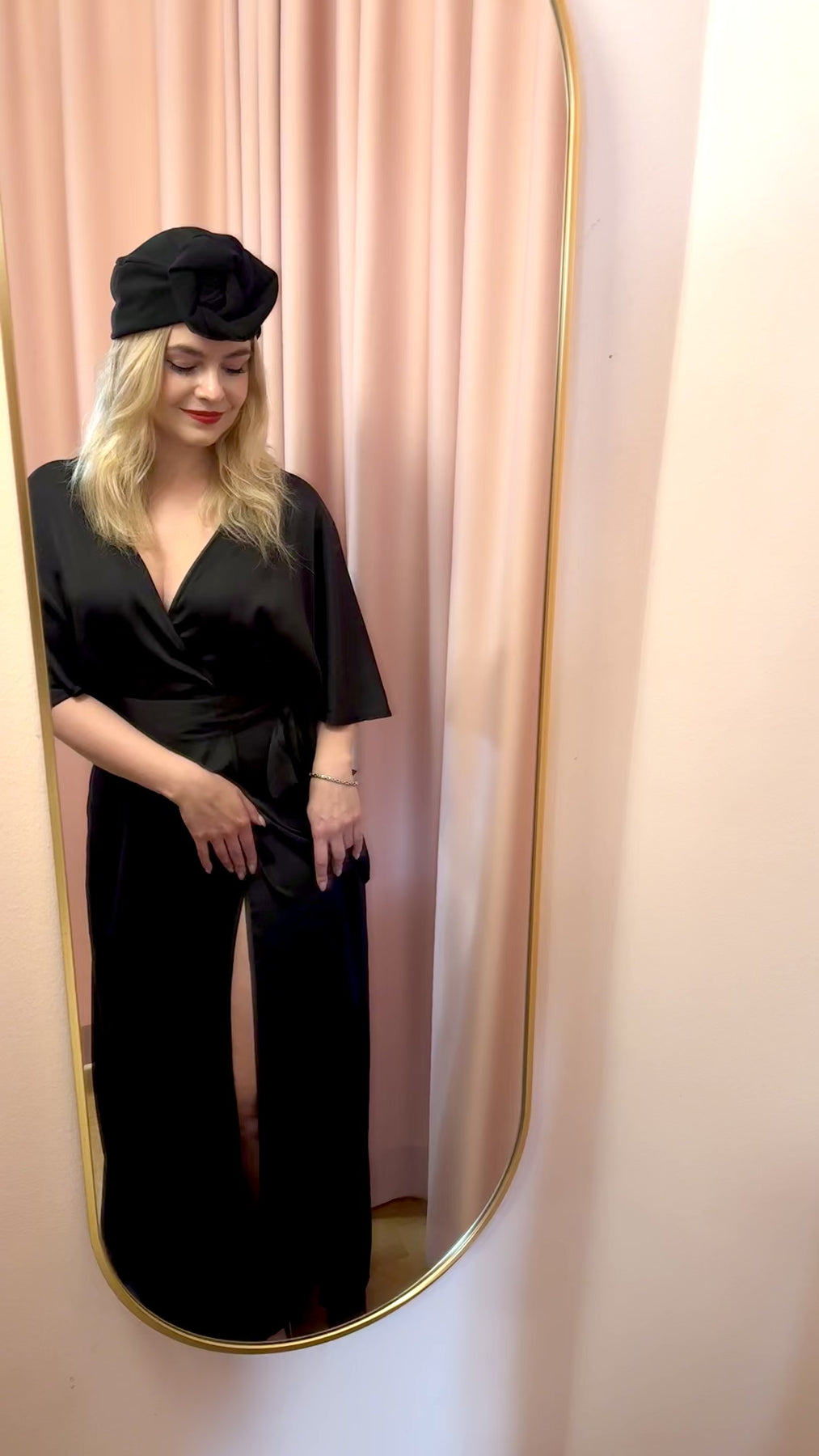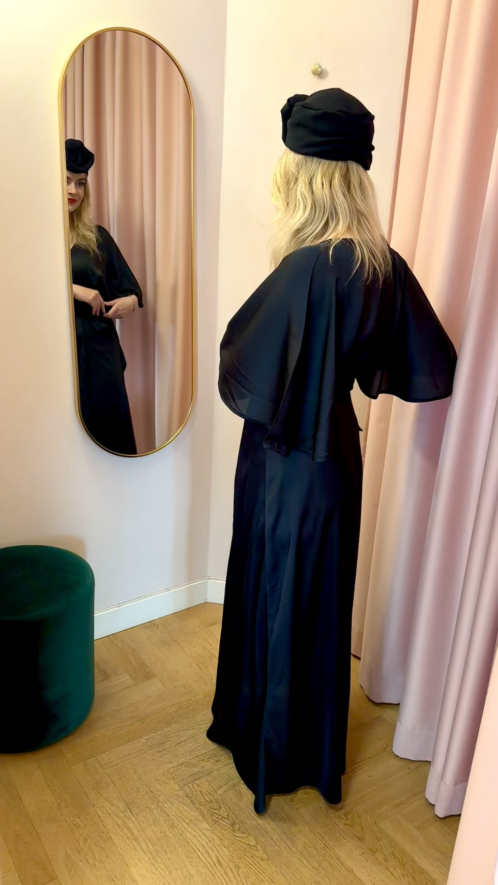 Kappan är gjord i svart satin från en original 30-talsdesign. De vackra "fjärilsärmarna" passar perfekt och är helt i stil med 30-talets förkärlek för Hollywood-glamour från guldåldern. Kappan knyts i midjan i en perfekt slåom-stil.