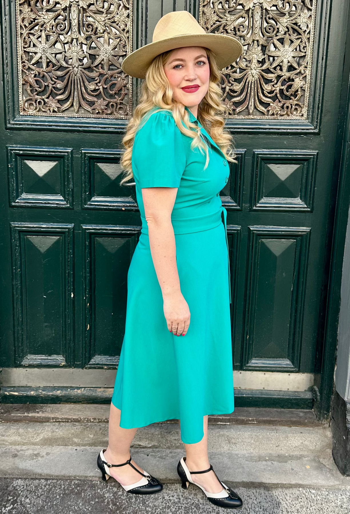 Knytbältet framhäver midjan och skapar den klassiska timglassilhuetten i vintagestil. Det finns 3 små knappar på framsidan av bröstet och klänningen har en dragkedja i sidan.