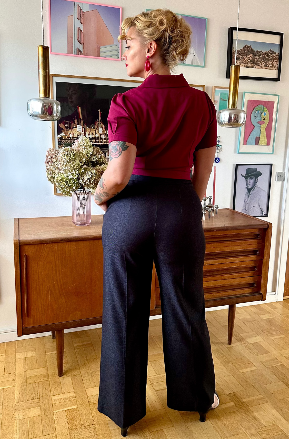 Benen har vackra symmetriska veck och klassiskt vida ben som faller smickrande runt höfter och lår och passar utmärkt till alla blusar och skjortor från din vintagegarderob. Ett pressveck framtill gör att benen ser extra långa ut!