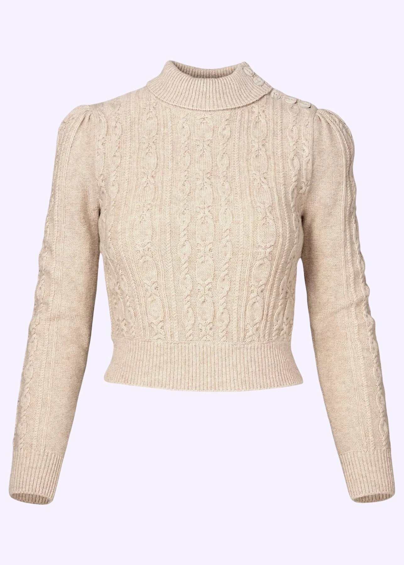 Tröjan har en hög hals med nedvikt krage, som stängs med en dekorativ knapprad i sidan och upp över axeln. De smala ärmarna avslutas med Emmys karakteristiska puff vid axlarna, och den figursydda passformen framhäver midjan och skapar en vacker, feminin silhuett.
