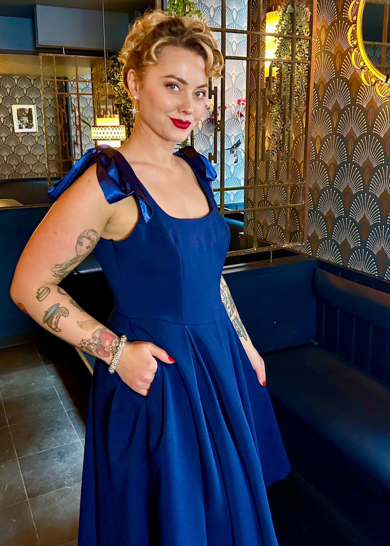 De fina satinslöjorna på axlarna ger ett feminint inslag, medan stretchfodret i livet ger en smickrande och bekväm passform. Klänningen har dessutom djupa fickor, dold dragkedja bak och en vacker struktur som förenar funktion och elegans.