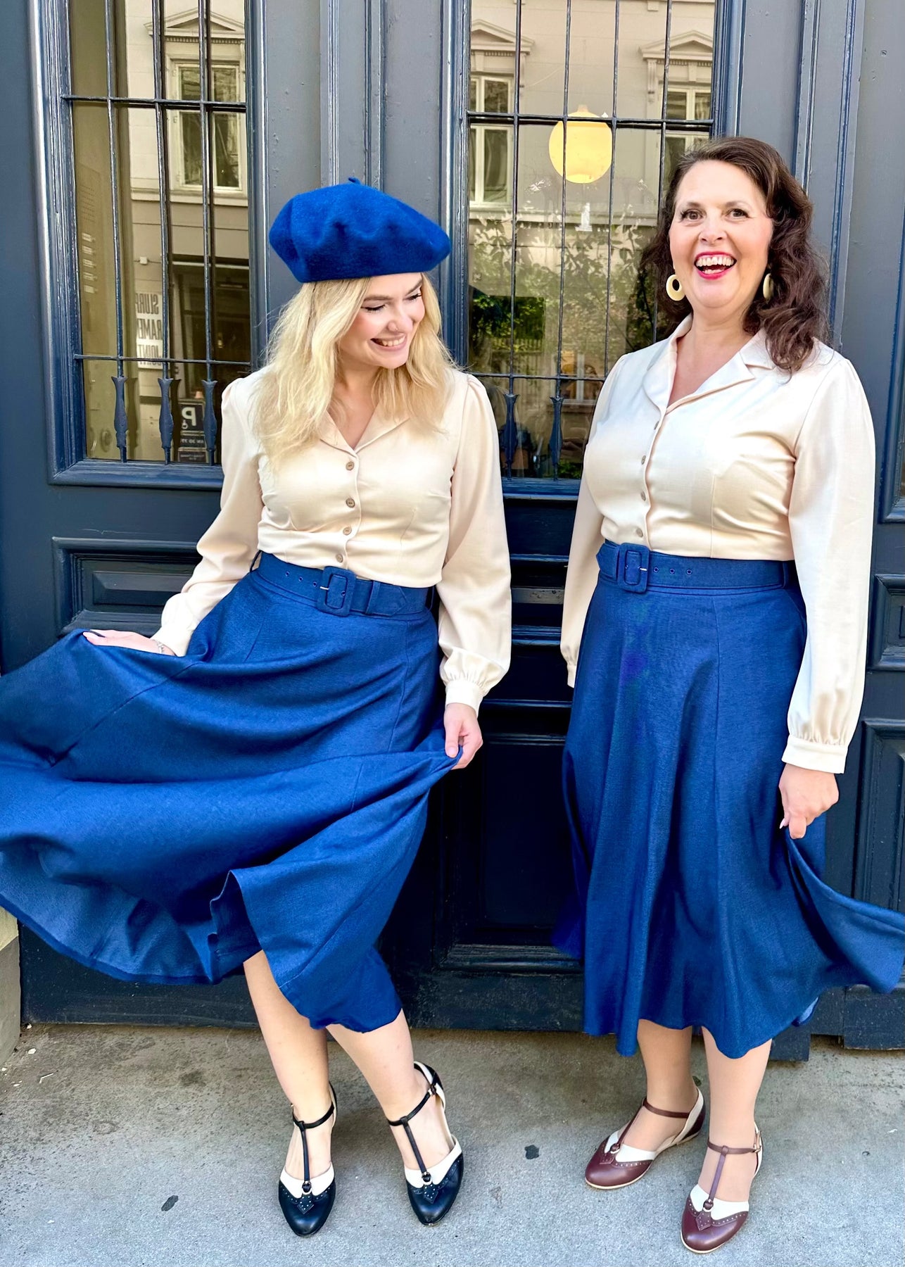 Midjan markeras av ett brett bälte på ca 5 cm som framhäver timglasfiguren och ger kjolen det autentiska retro uttryck som Daisy Dapper är känd för. Tyget är mjukt med lätt stretch och har ett vackert navy denimlook – ett perfekt alternativ till högt midjade vintagejeans när du vill ha en mer feminin stil.