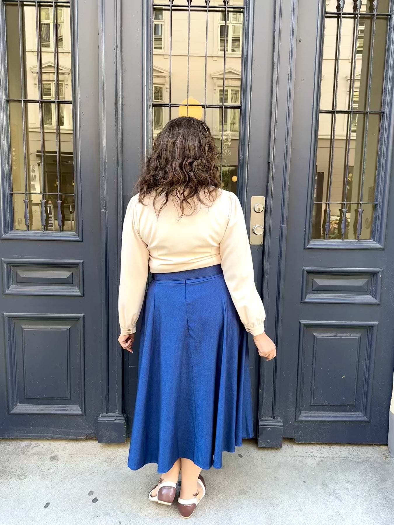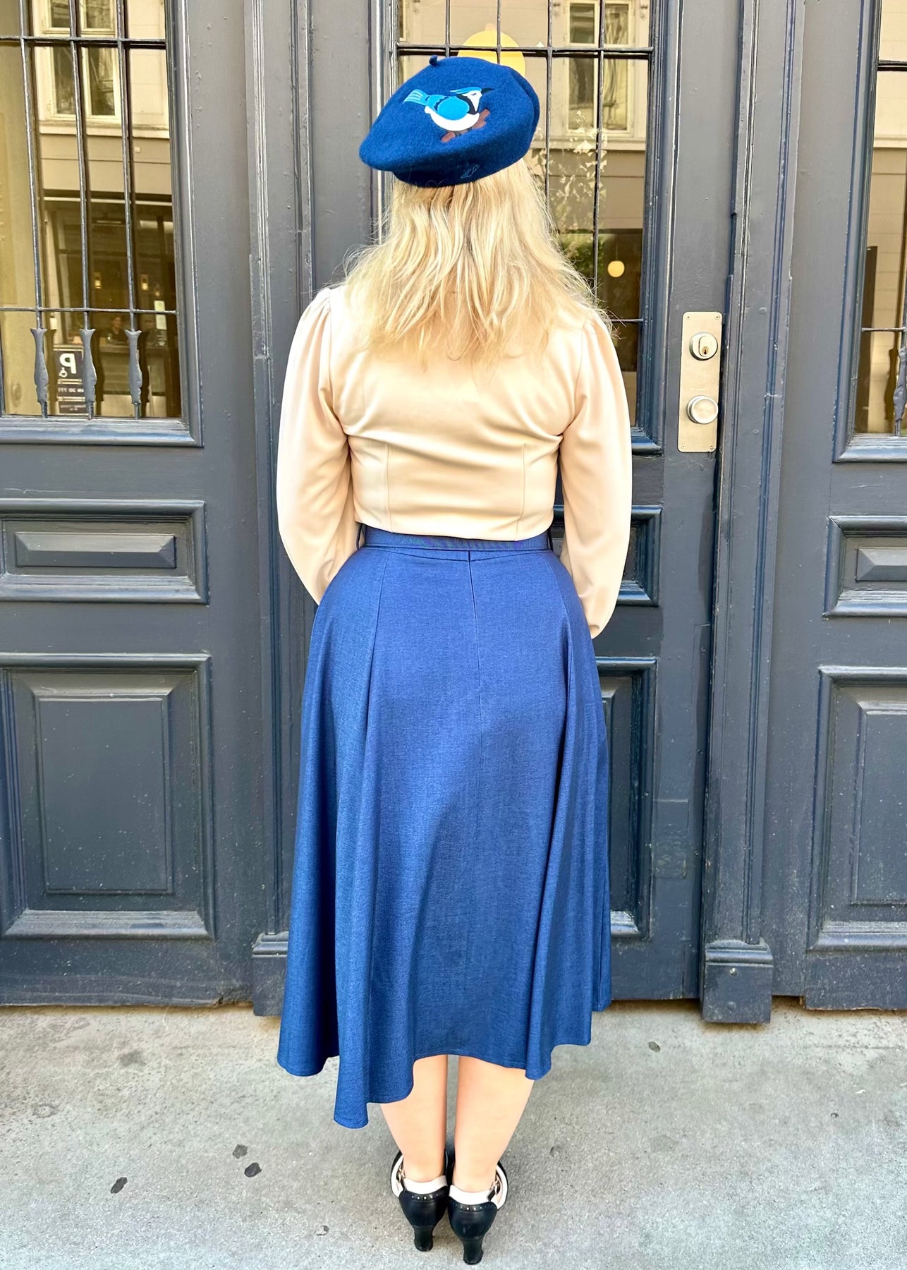 Kjolen är sydd i flera paneler för en perfekt passform och naturlig rörelse i tyget. Den har en elegant längd till mitten av vaden (ca 80 cm i storlek 36) – perfekt för både vardagsbruk och mer sofistikerade vintageinspirerade looks.
