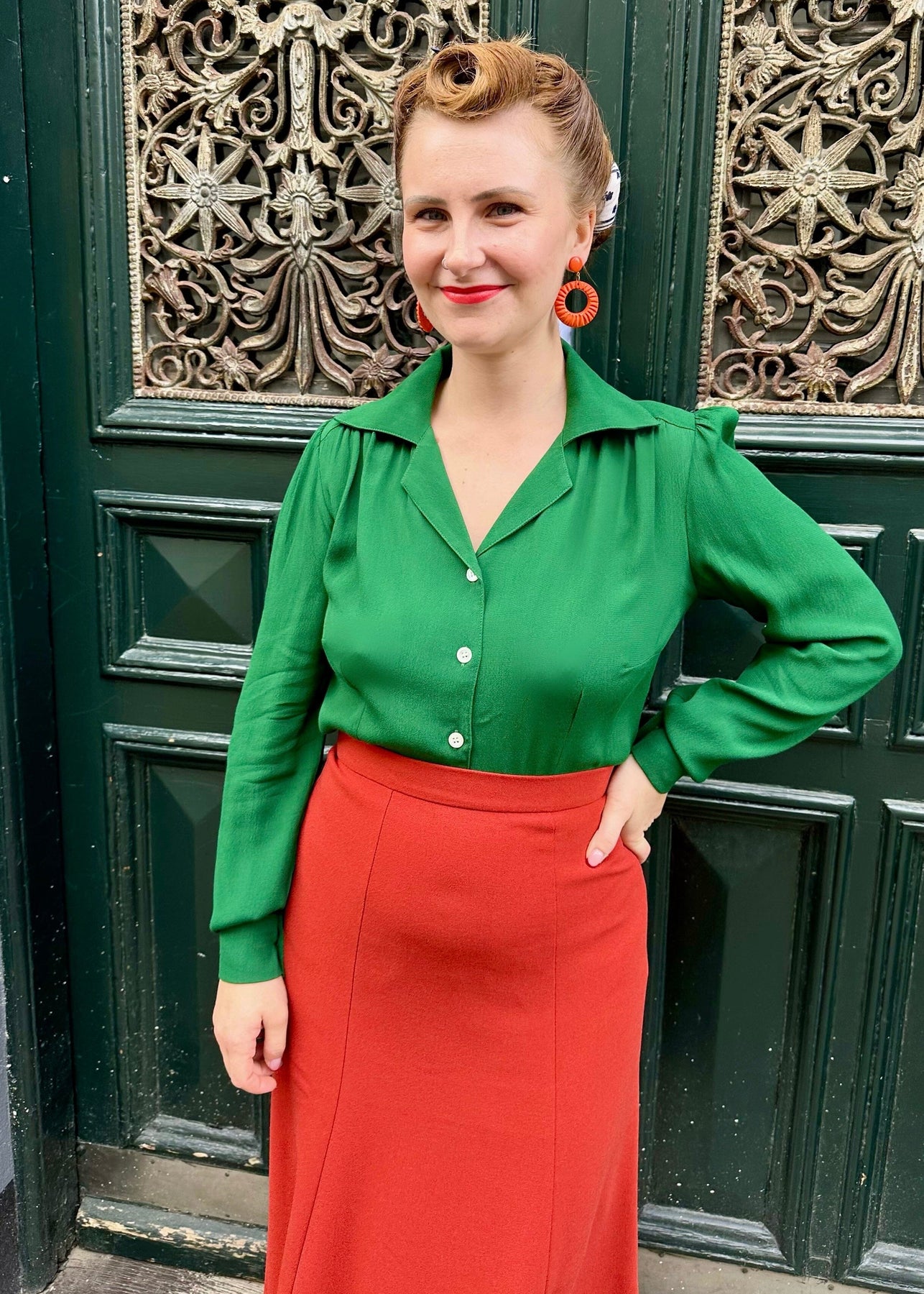 Den fina Gene-skjortan har den klassiska kavajkragen i autentisk 1940-talsstil som faller vackert över axlarna och eleganta pärlemorknappar framtill.