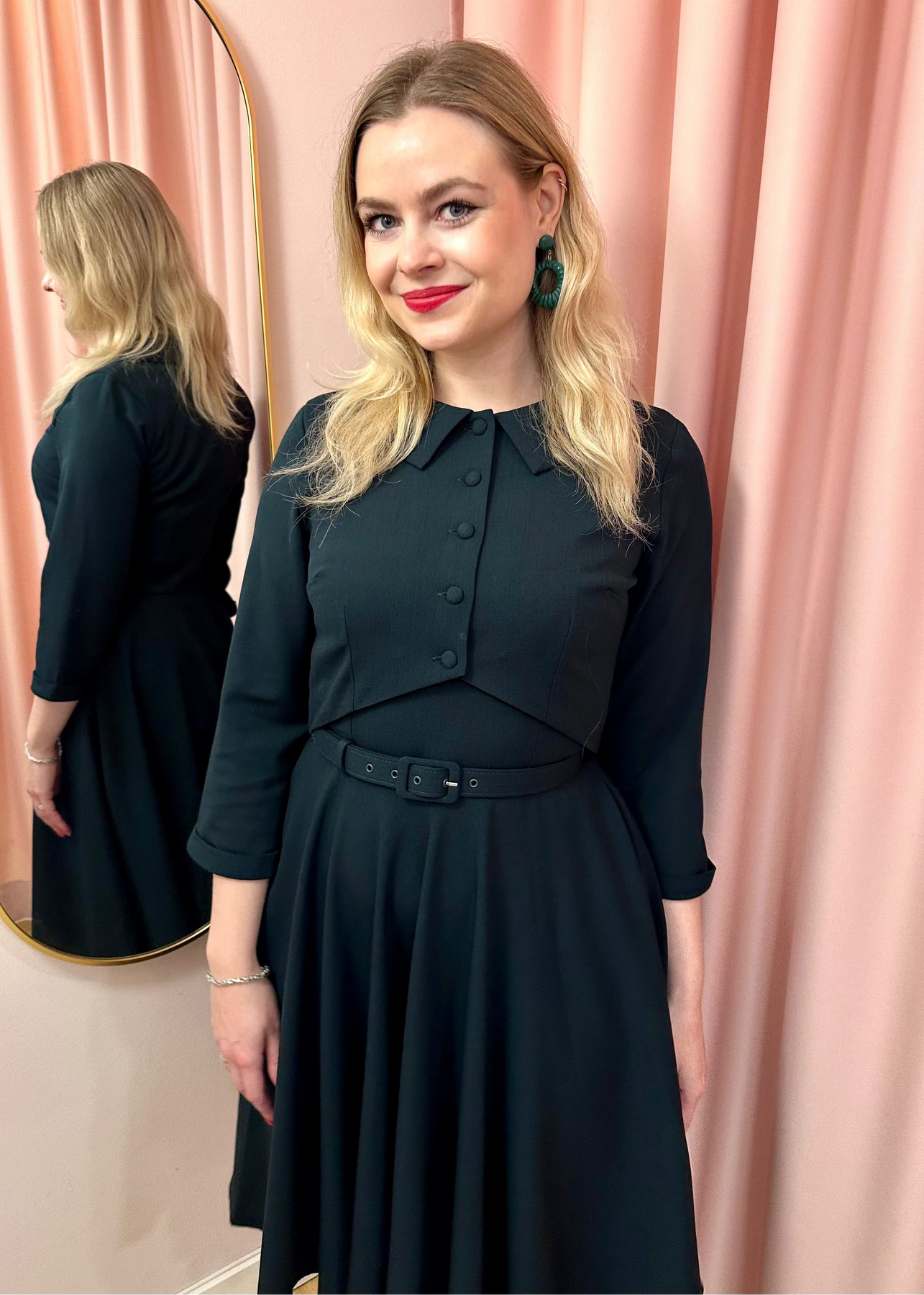 Kjolen är en full swingkjol i äkta 1950-talsstil och det medföljande bältet framhäver midjan och fulländar swinglooken.