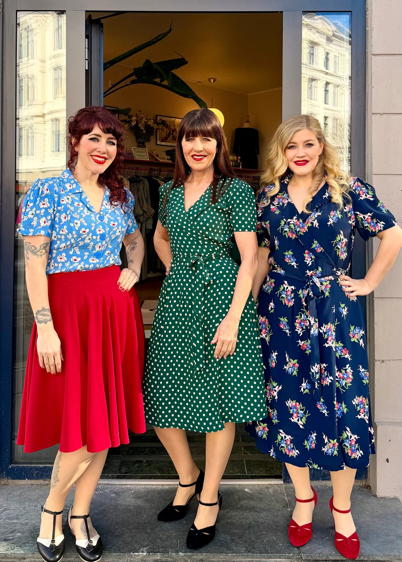 Klänningen är tillverkad i Bloomsburys signaturtyg "rayon crepe de chine", som ger klänningen precis rätt vintage-look samtidigt som den faller vackert över höfter och lår.