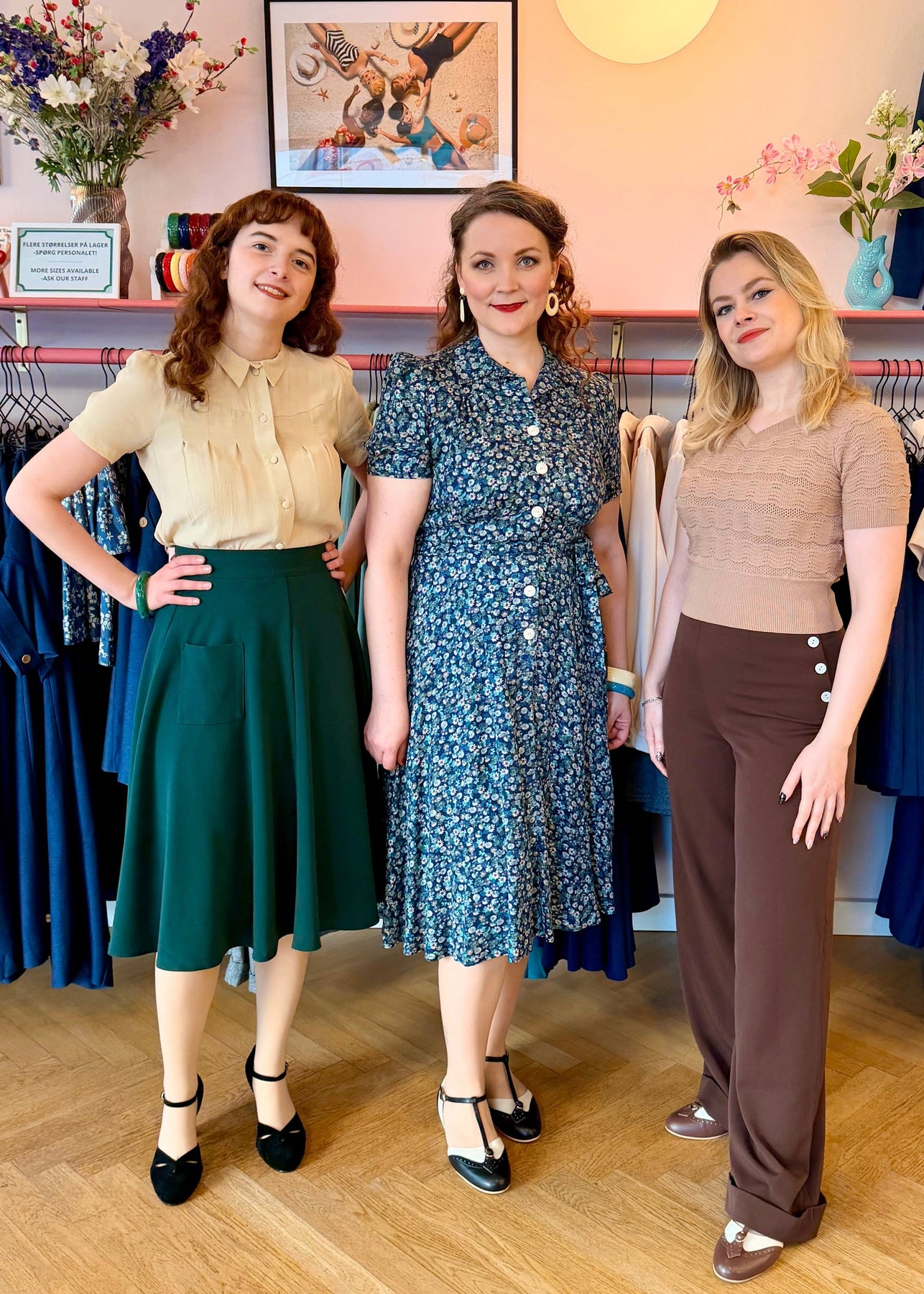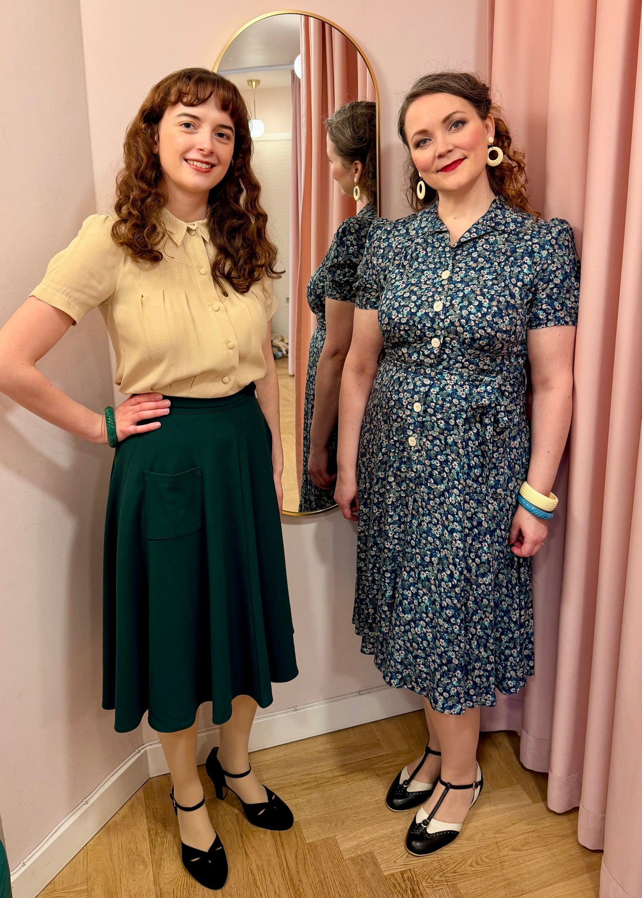 Kjolen har en lätt utsvängd form som ger rörelsefrihet och ett elegant fall. I sann 1940-talsanda har klänningen ingen dragkedja – den knäpps istället under midjan, precis som originalen. Diskreta axelvaddar fulländar den autentiska silhuetten och ger struktur och balans.