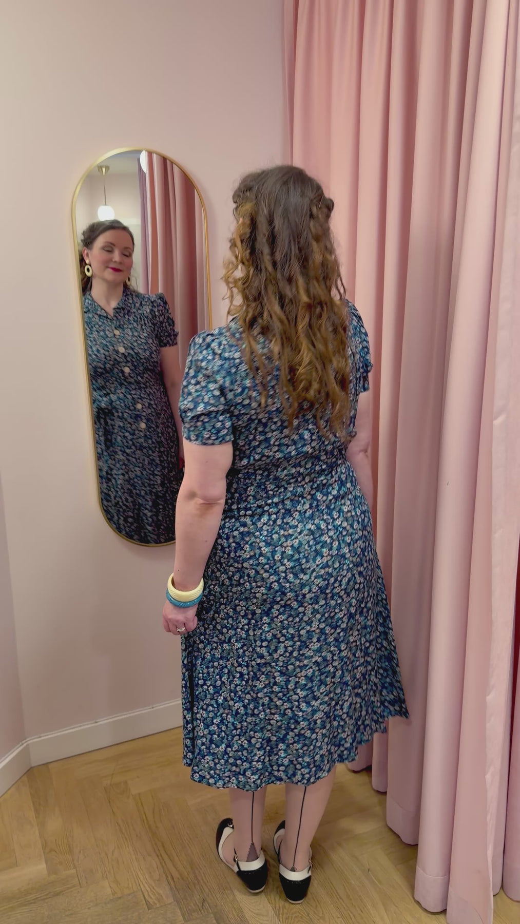 Klänningen har en klassisk skjortliv med axelok och små rynk ovanför bysten som faller vackert ner mot midjan. Det medföljande knytbandet markerar midjan och skapar den karakteristiska timglassilhuetten som 1940-talet är känt för.