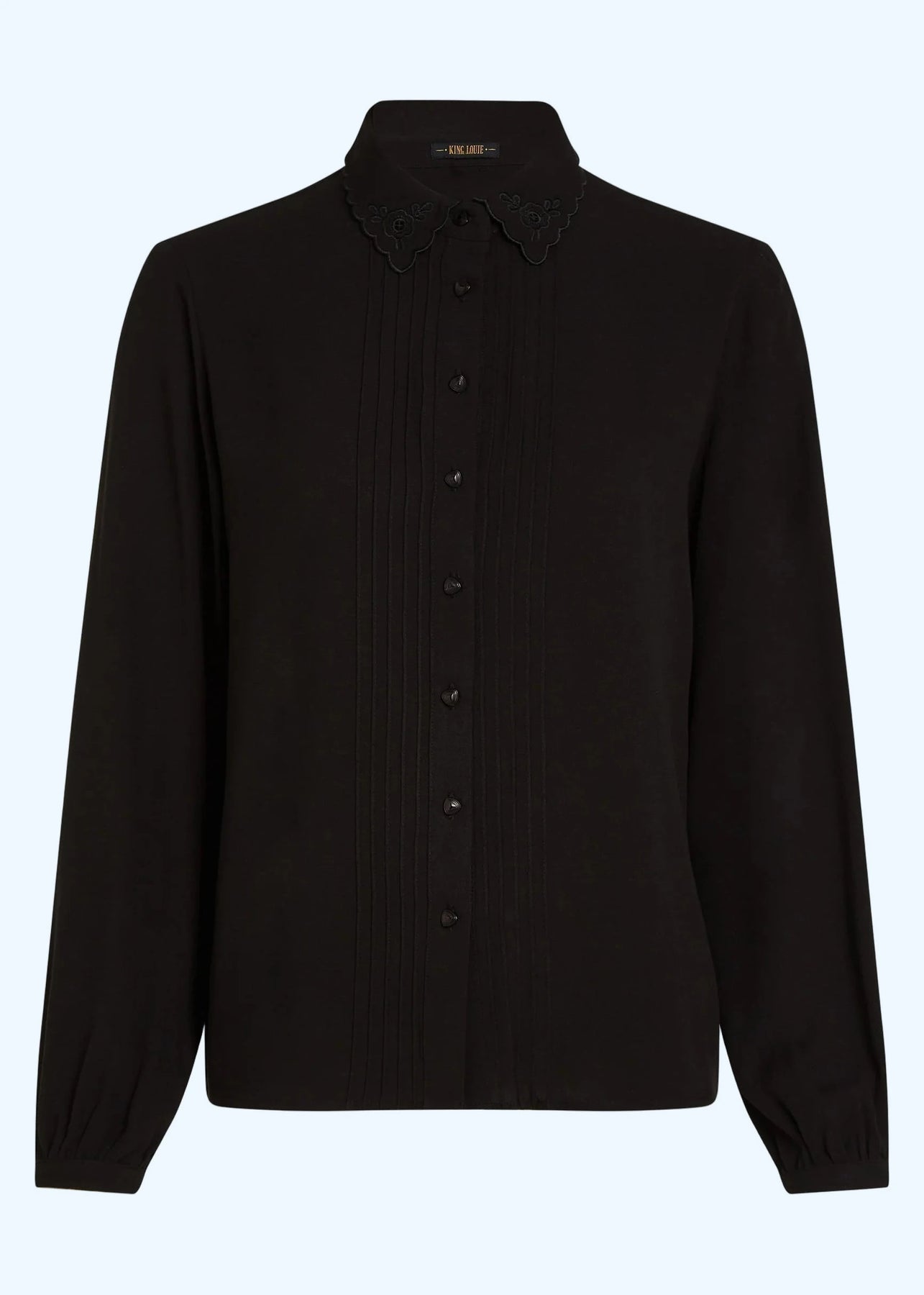 Den här vackra svarta blusen kombinerar sofistikerad elegans med klassisk vintageinspiration. Tillverkad i mjuk vävd viskos som faller lätt och behagligt mot huden.