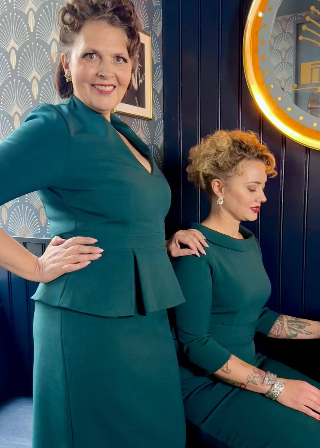 Klänningen är skapad för att framhäva figuren på ett smickrande sätt, med en delikat peplum-detalj som markerar midjan och ett linjeband som drar blicken till kroppens smalaste punkt – och skapar den klassiska hourglass-siluetten.