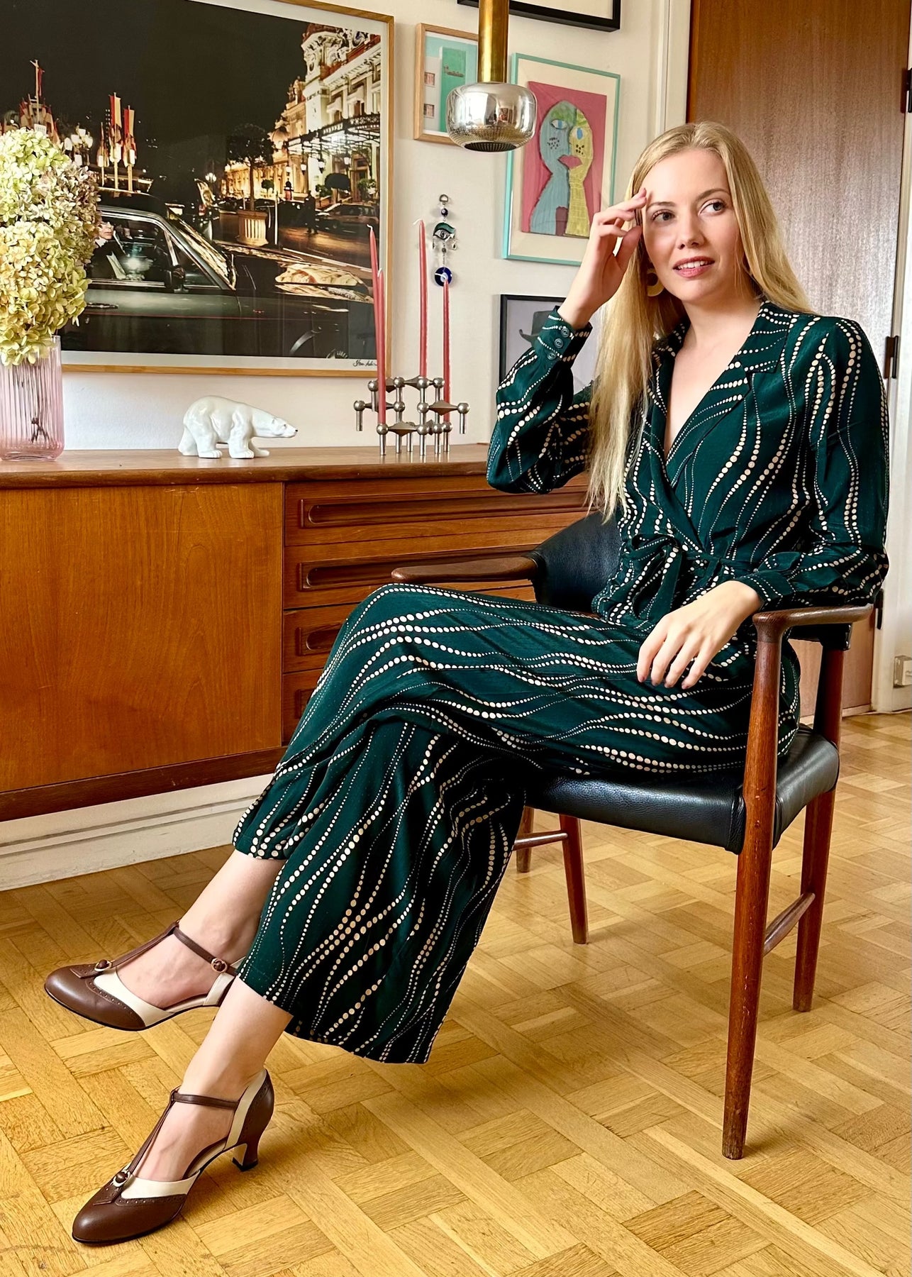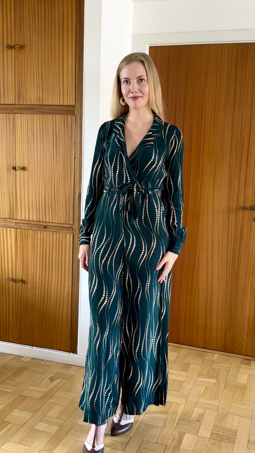 Doris twirl långärmad jumpsuit i mörkgrönt med prickar