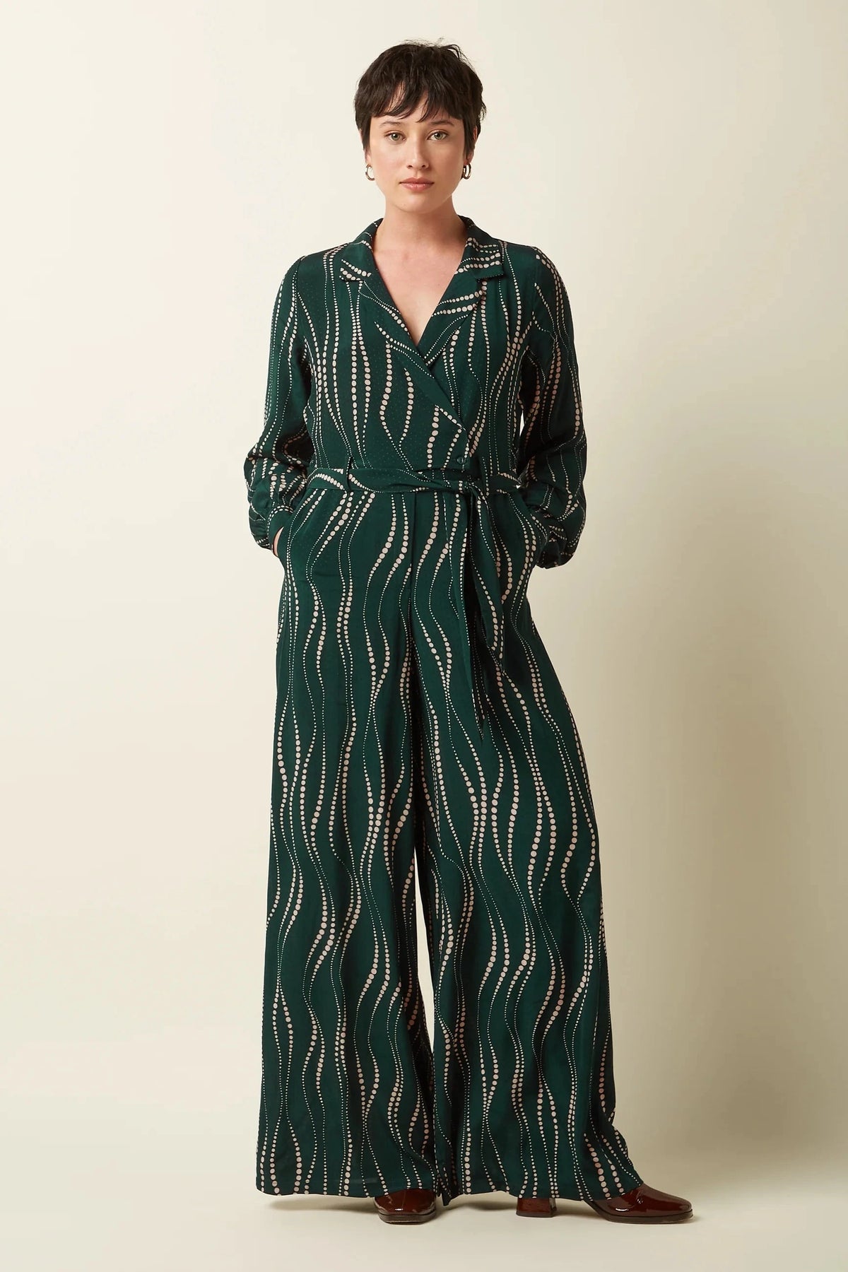 Långärmad jumpsuit från King Louie i mörkgrönt med beigefärgade prickar.