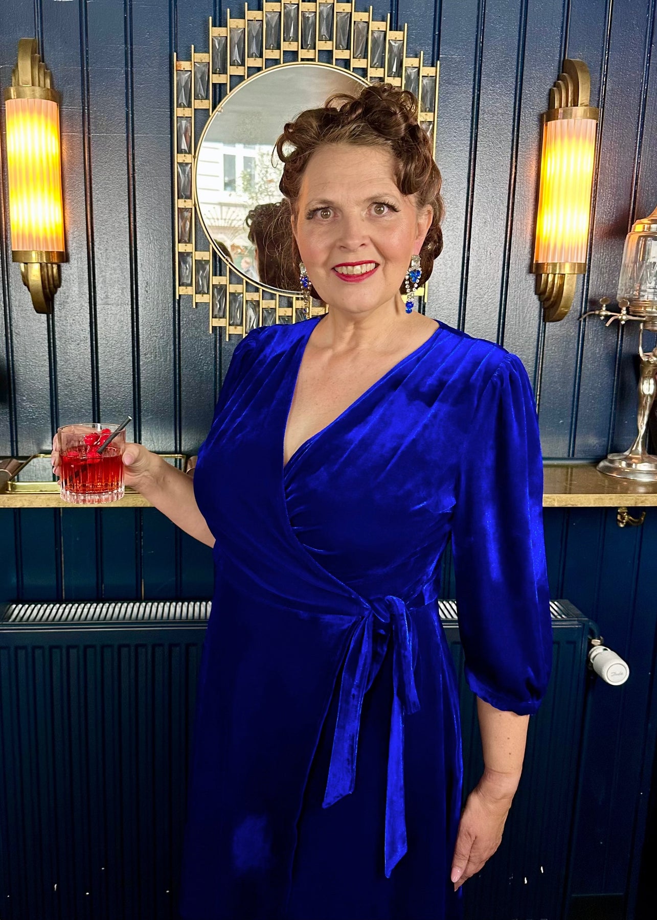 Vacker omlottklänning i blå velour från Daisy Dapper.
