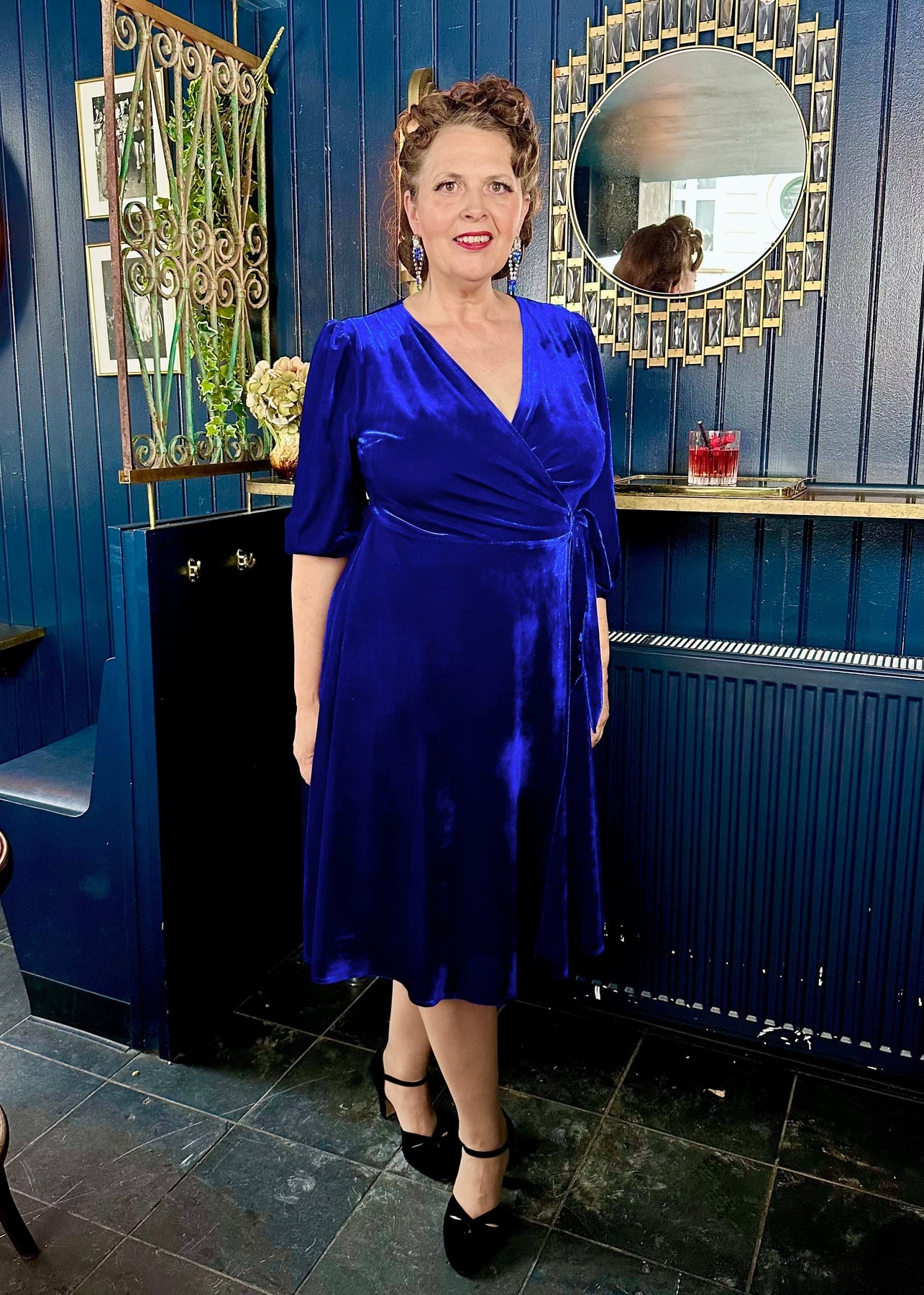 Härlig omlottklänning i vacker blå stretchvelour - perfekt för festliga tillställningar.