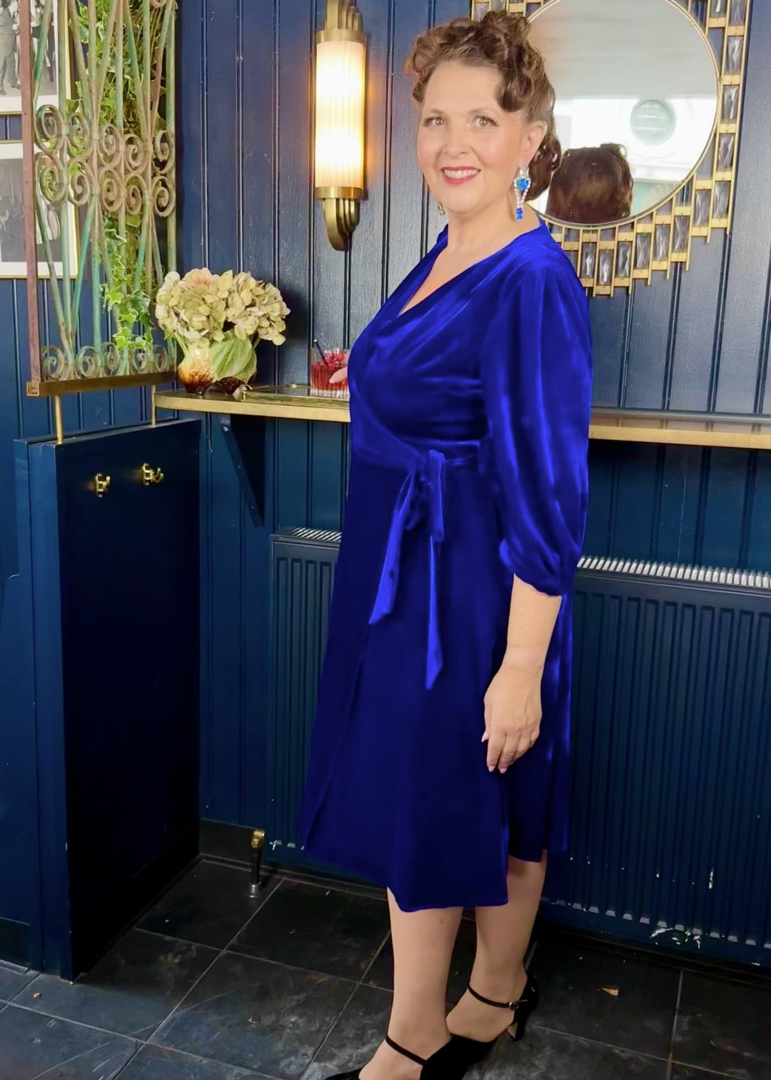 Jane omlottklänning i blå velour med 3/4 ärmar