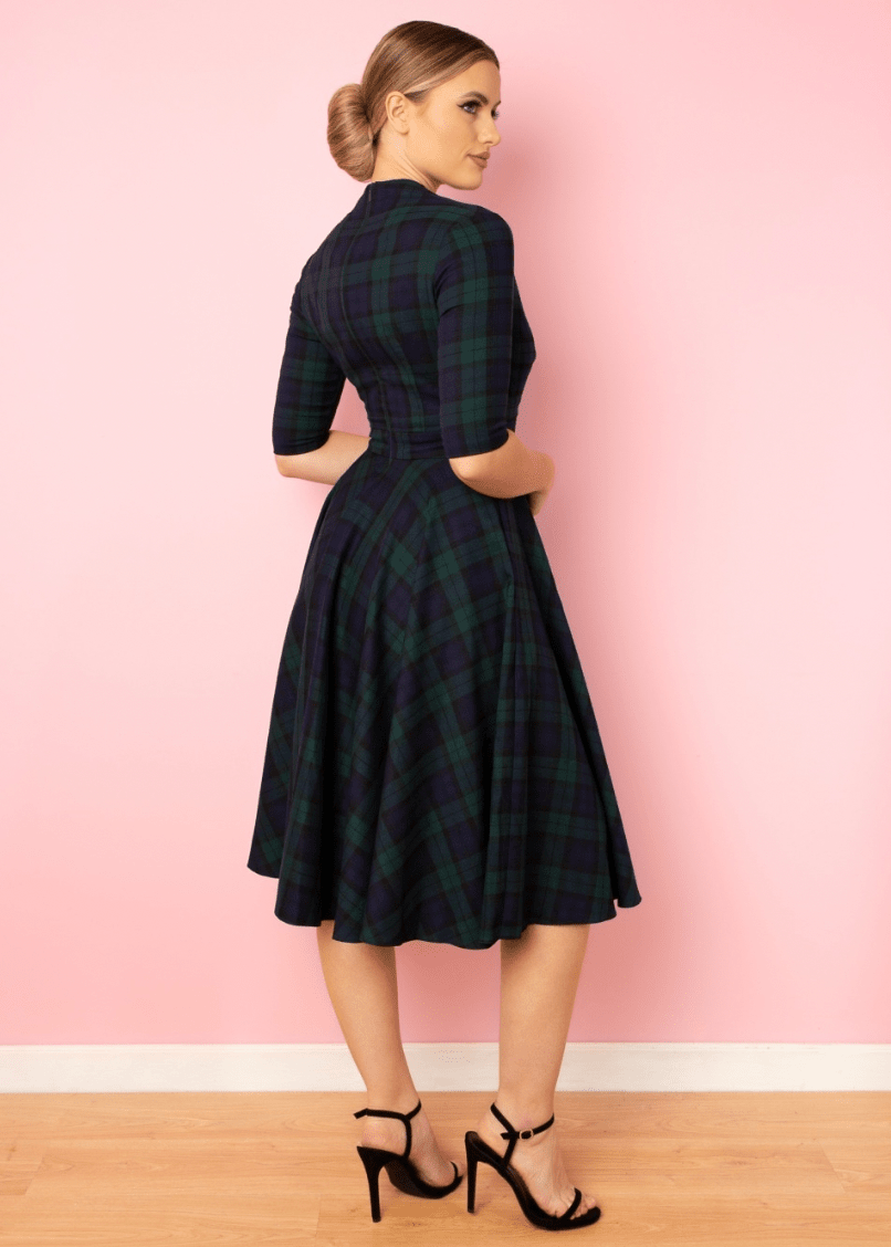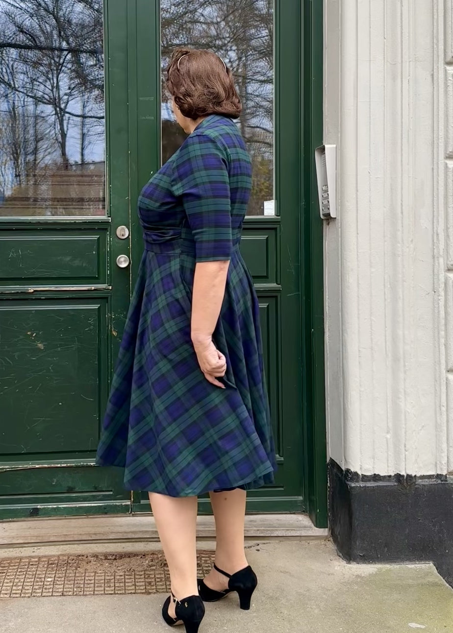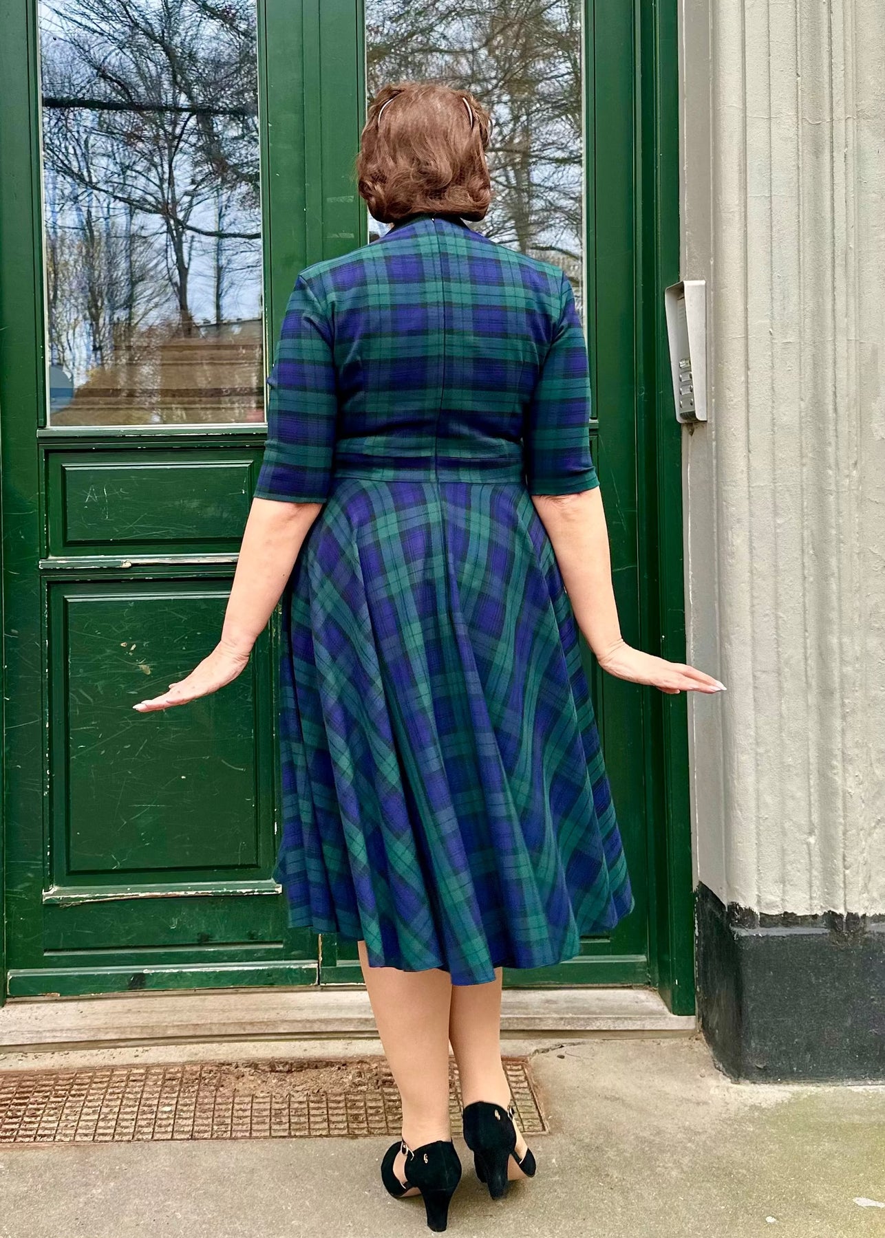 Vintage-inspirerad swingklänning i marinblått och grönt rutmönster