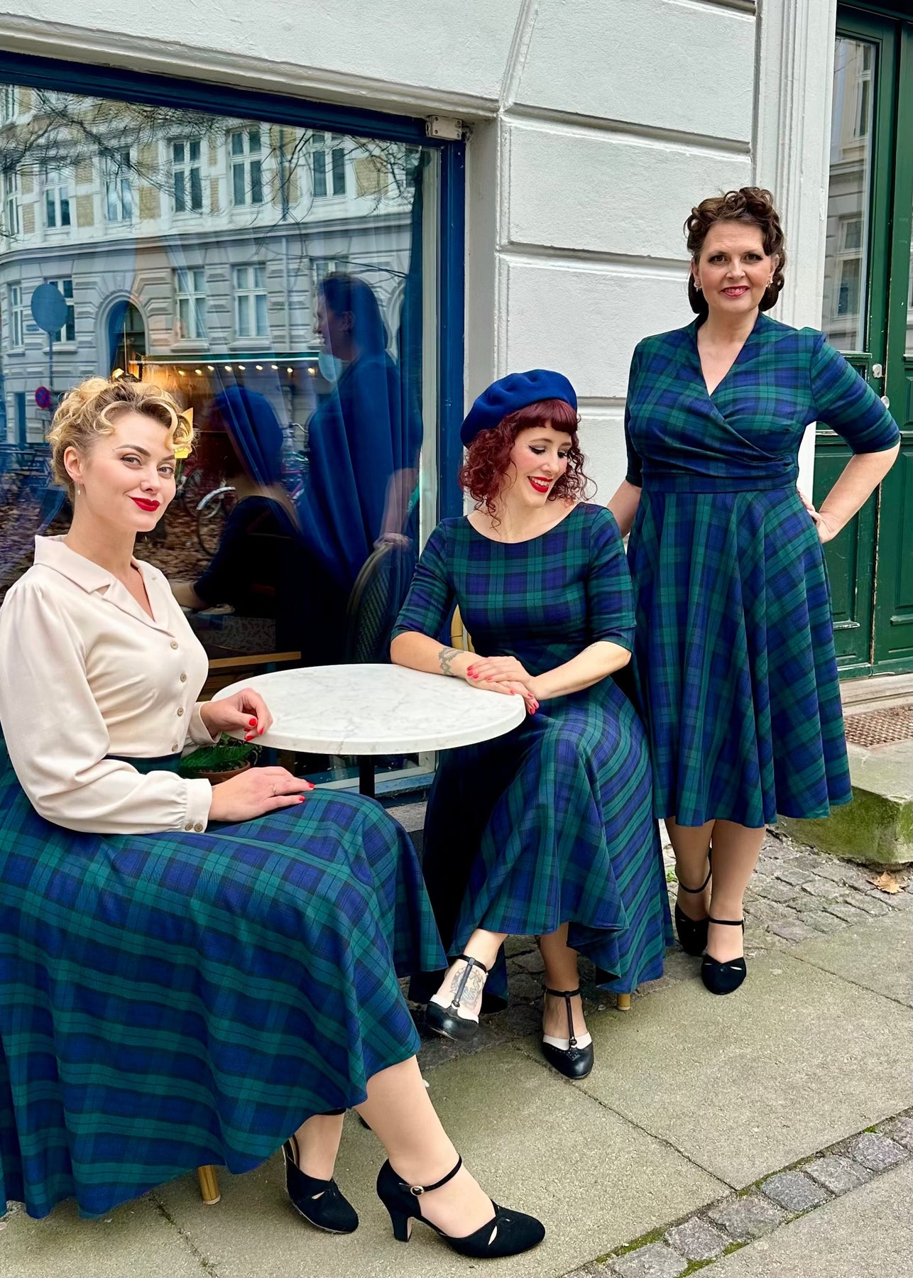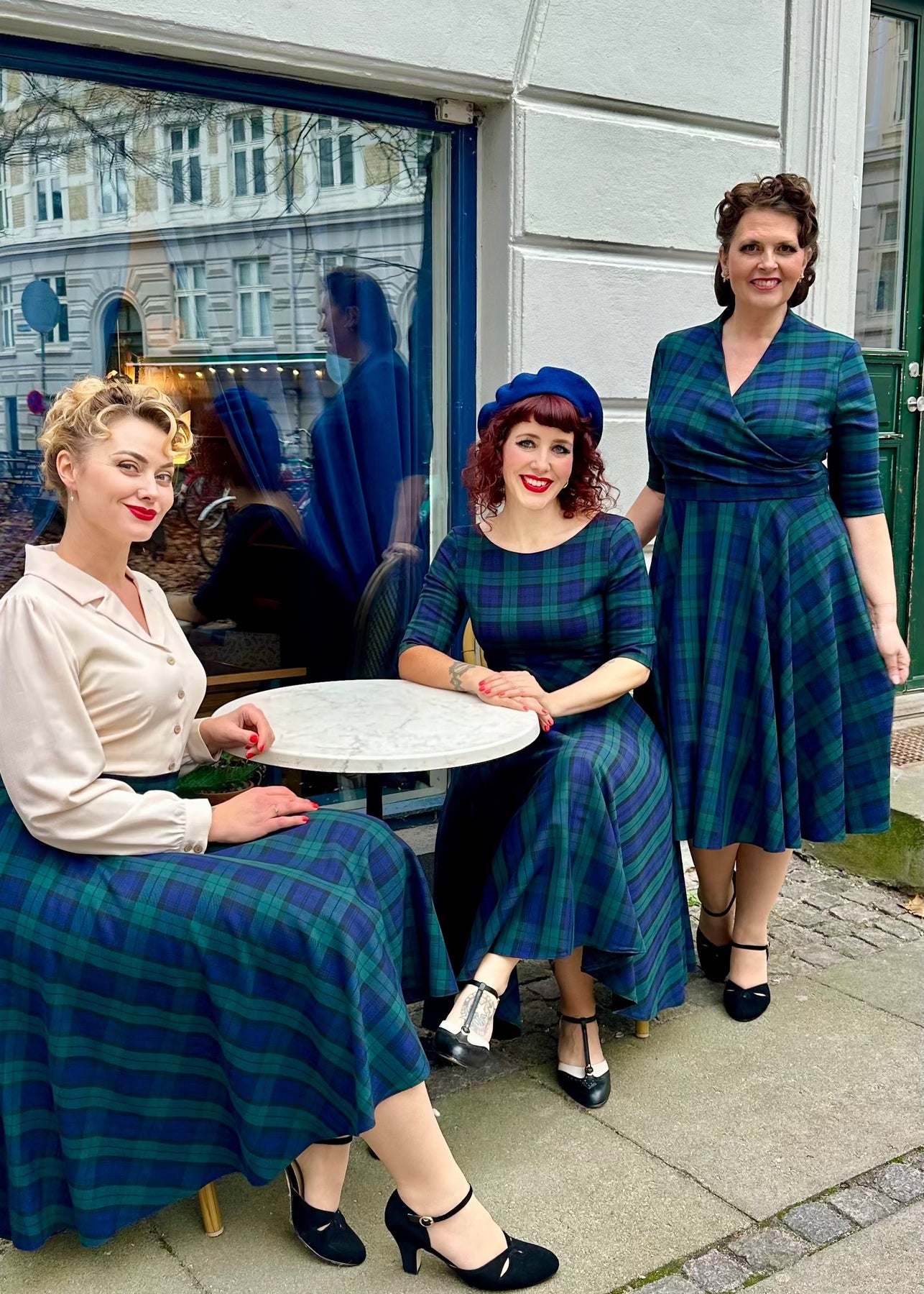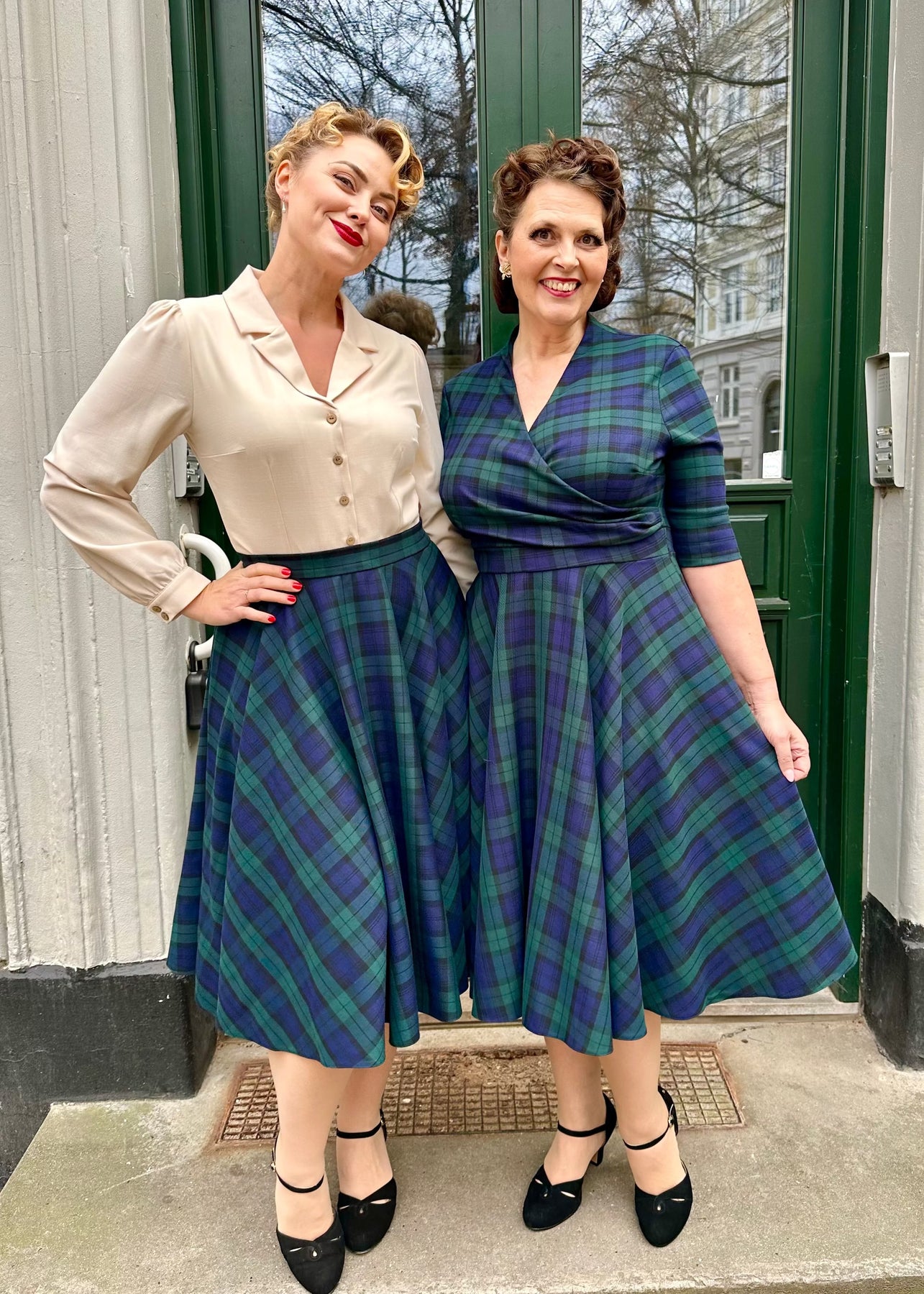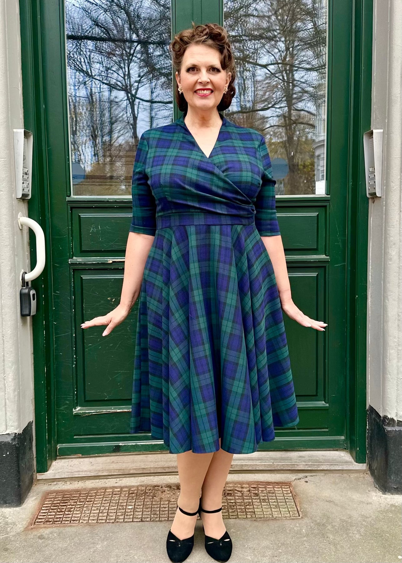 Den djupa marinblå färgen med gröna rutor passar perfekt till både neutrala och färgstarka accessoarer – bär den med svarta skor och handskar för en autentisk 1950-talslook, eller lägg till röda detaljer för ett mer festligt uttryck.