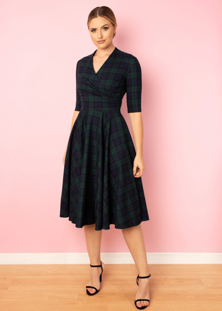 Den här underbara swingklänningen från The Pretty Dress Company kombinerar tidlös vintage-elegans med modern passform. Klänningen är sydd i ett vackert marinblått och grönt rutmönster, som ger ett elegant och lekfullt retro-uttryck – perfekt för både vardag och fest.