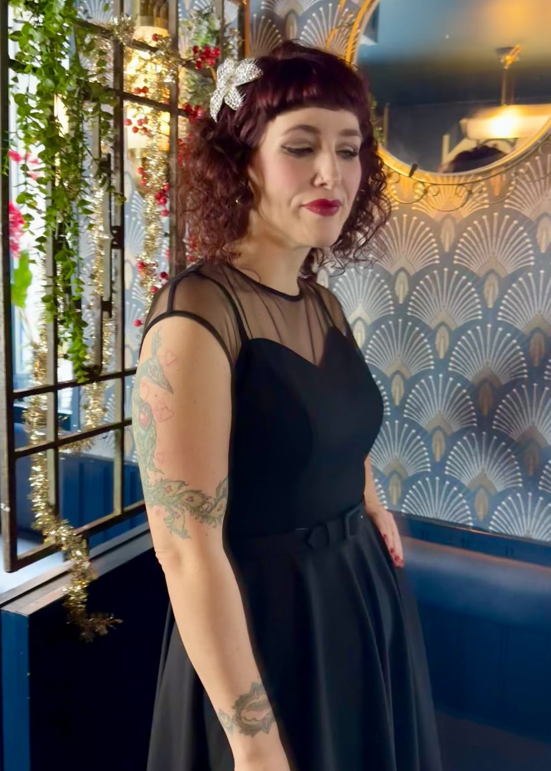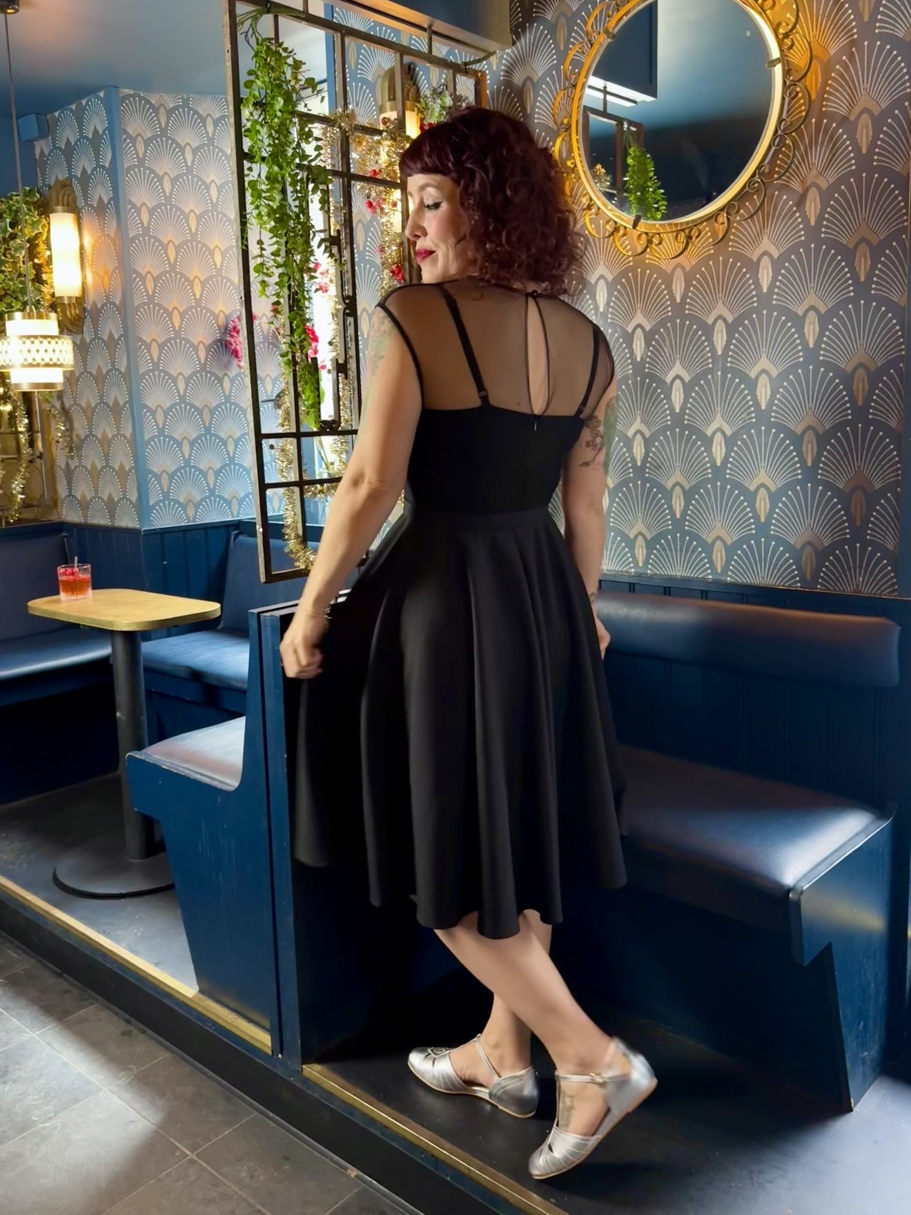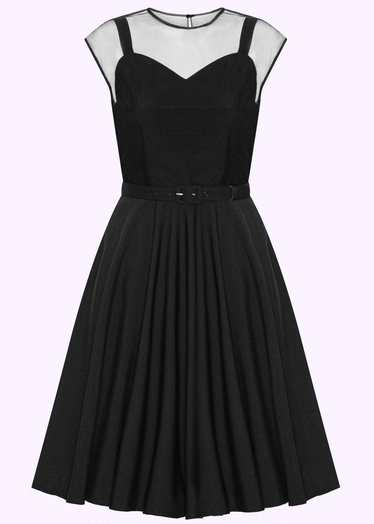 Denna underbara swingklänning kombinerar klassisk 1950-talsglamour med en modern och elegant twist. Den svarta klänningen har en vacker sweetheart-formad livdel, som framhävs av den transparenta mesh-delen upptill – en detalj som ger ett sofistikerat men ändå diskret sensuellt uttryck. En riktigt vacker festklänning som passar både till speciella tillfällen, middagar och kvällsevent.
