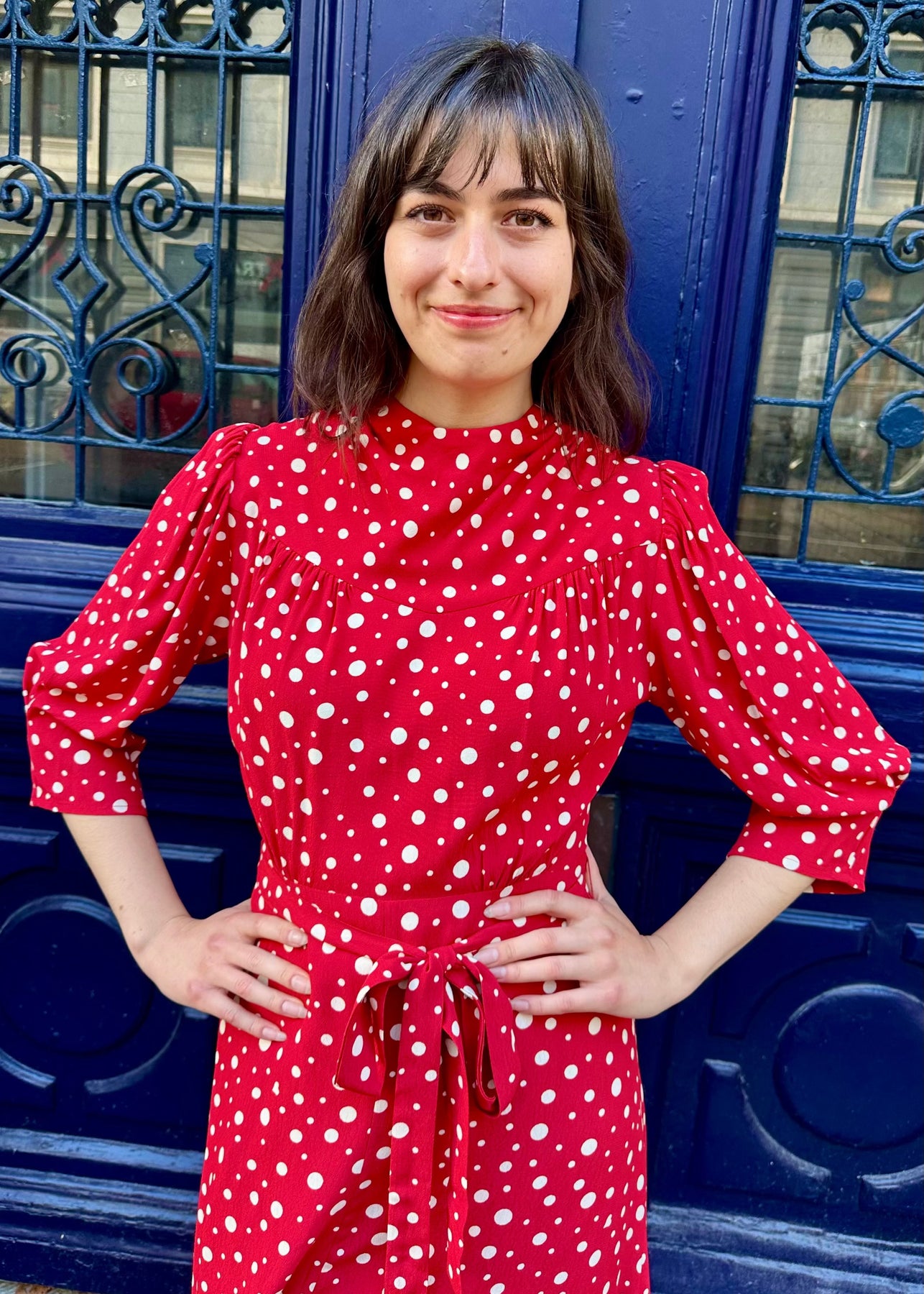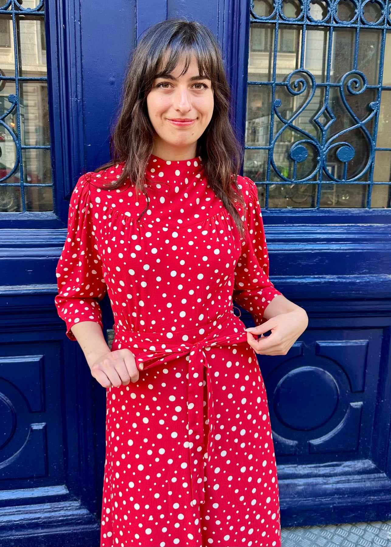 Ett knytbälte markerar midjan och framhäver den feminina siluetten.