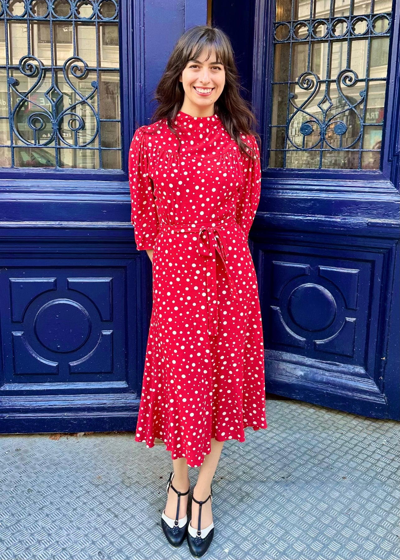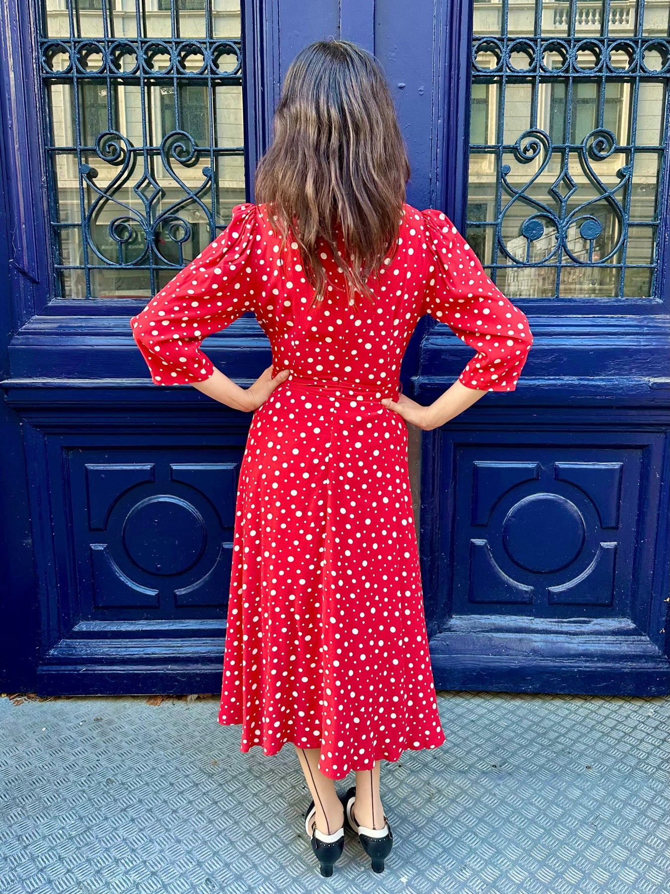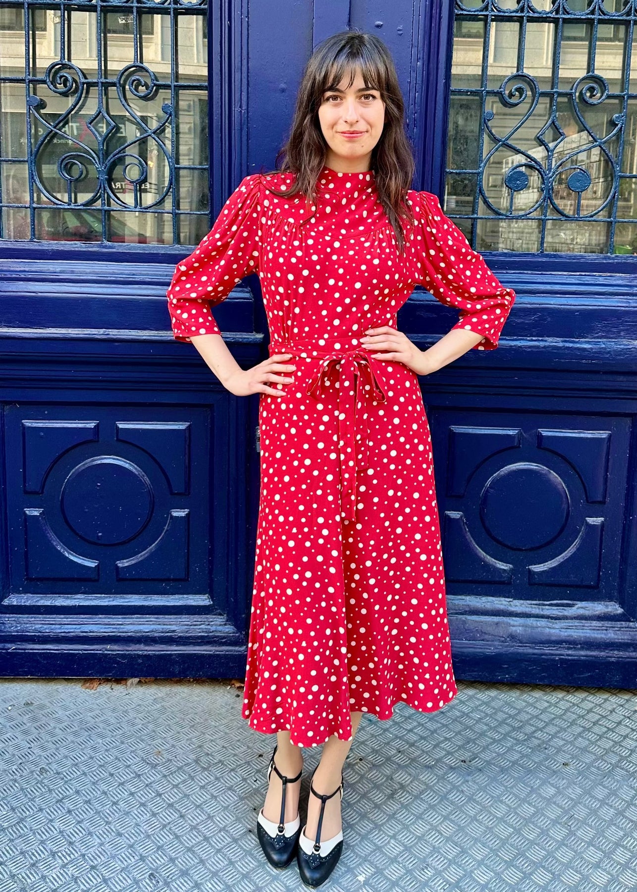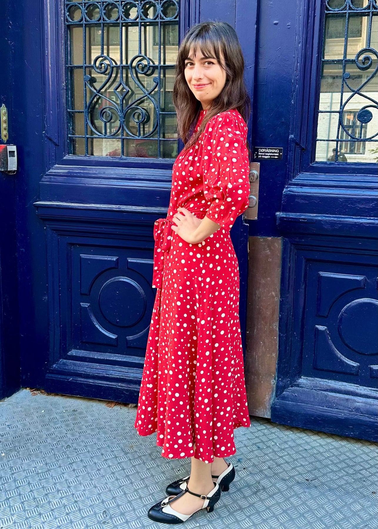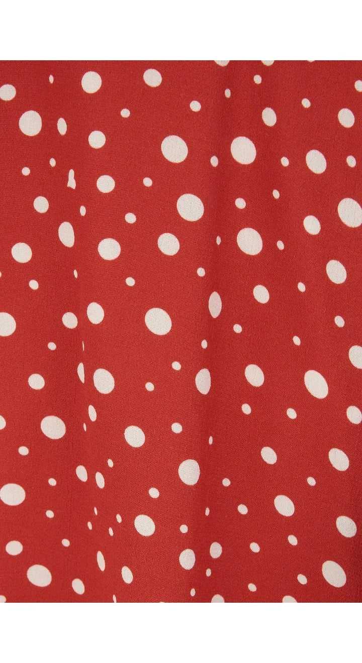 Den röda basen pryds av vita prickar i varierande storlek – ett tidlöst och lekfullt mönster.