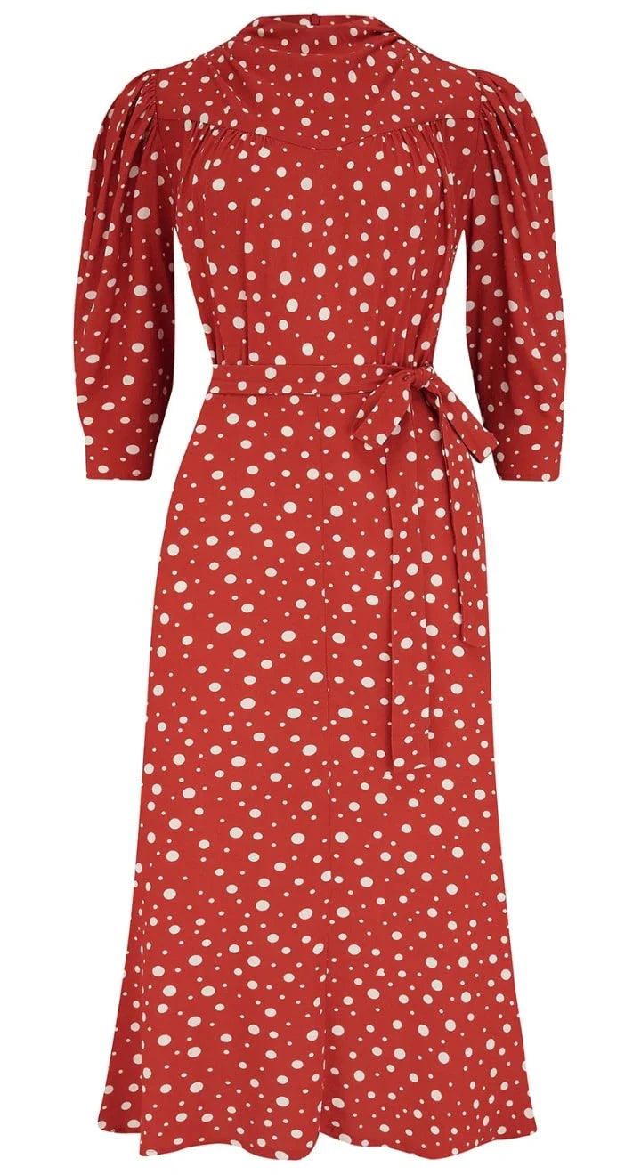 Underbar klänning i äkta 1930- och 1940-talsstil från Weekend Doll. Den vackra Rita-klänningen har ett smickrande snitt och ett elegant fall tack vare den klassiska bias cut-skärningen som ger ett mjukt, böljande uttryck.