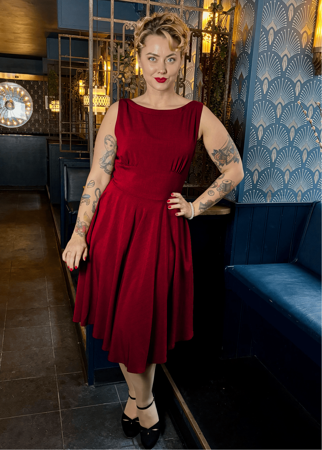 Den vackra Ruby swingklänningen från Daisy Dapper är tillbaka i en ny, strålande röd nyans – nu med breda axelband och ett fullt solkjol för maximal vintage elegans och rörelse. Ruby är designad för att framhäva midjan och skapa den ikoniska timglassiluetten som är typisk för 1950-talets stil.