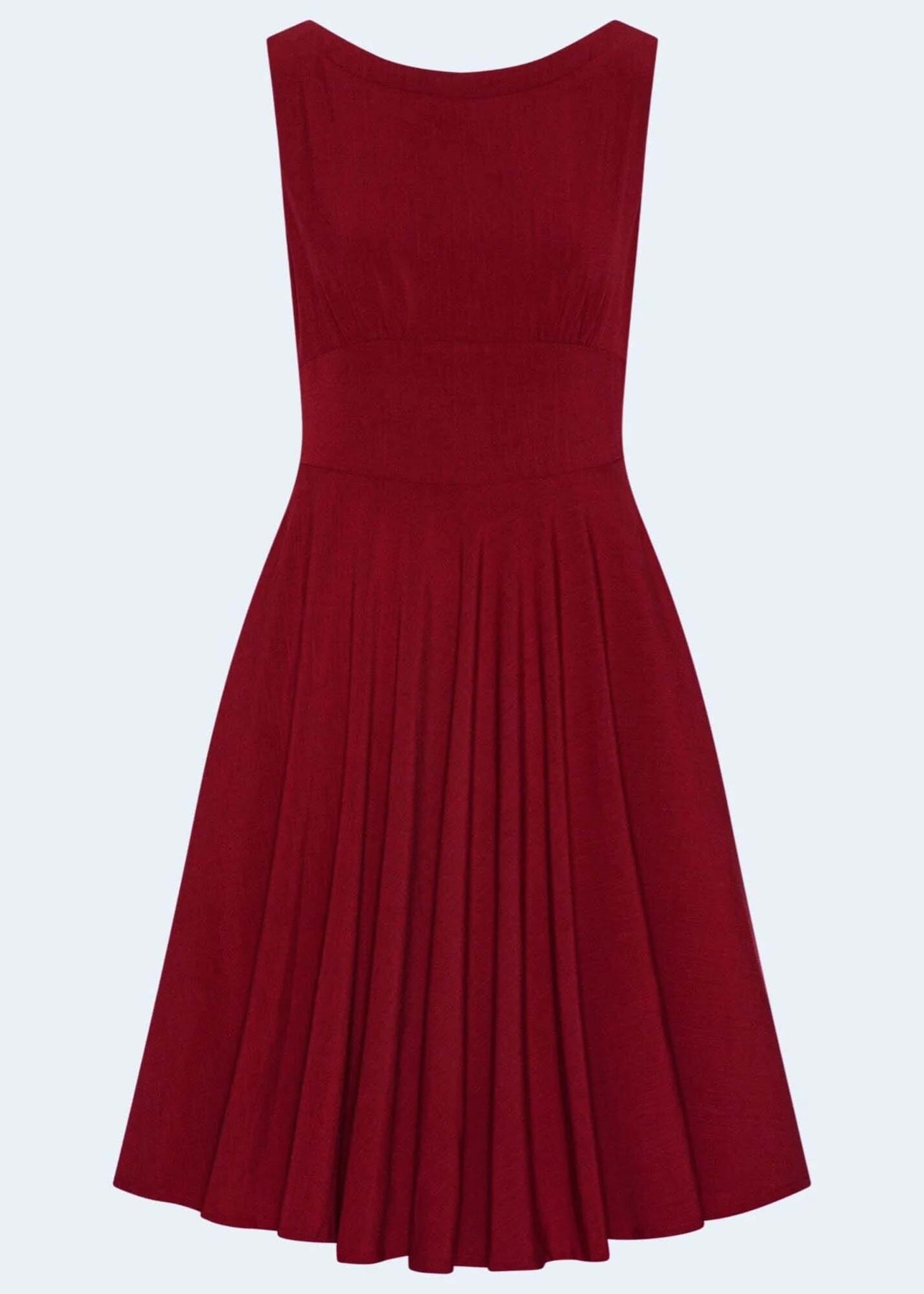 Klänningen har en klassisk båturringning som vackert ramar in axlarna, medan den feminina V-ryggen ger ett extra touch av retro charm. Överdelen sitter fint mot kroppen med lätta rynk under bysten där den möter det figursydda midjepartiet, innan kjolen går ut i sitt fulla swing-fall.