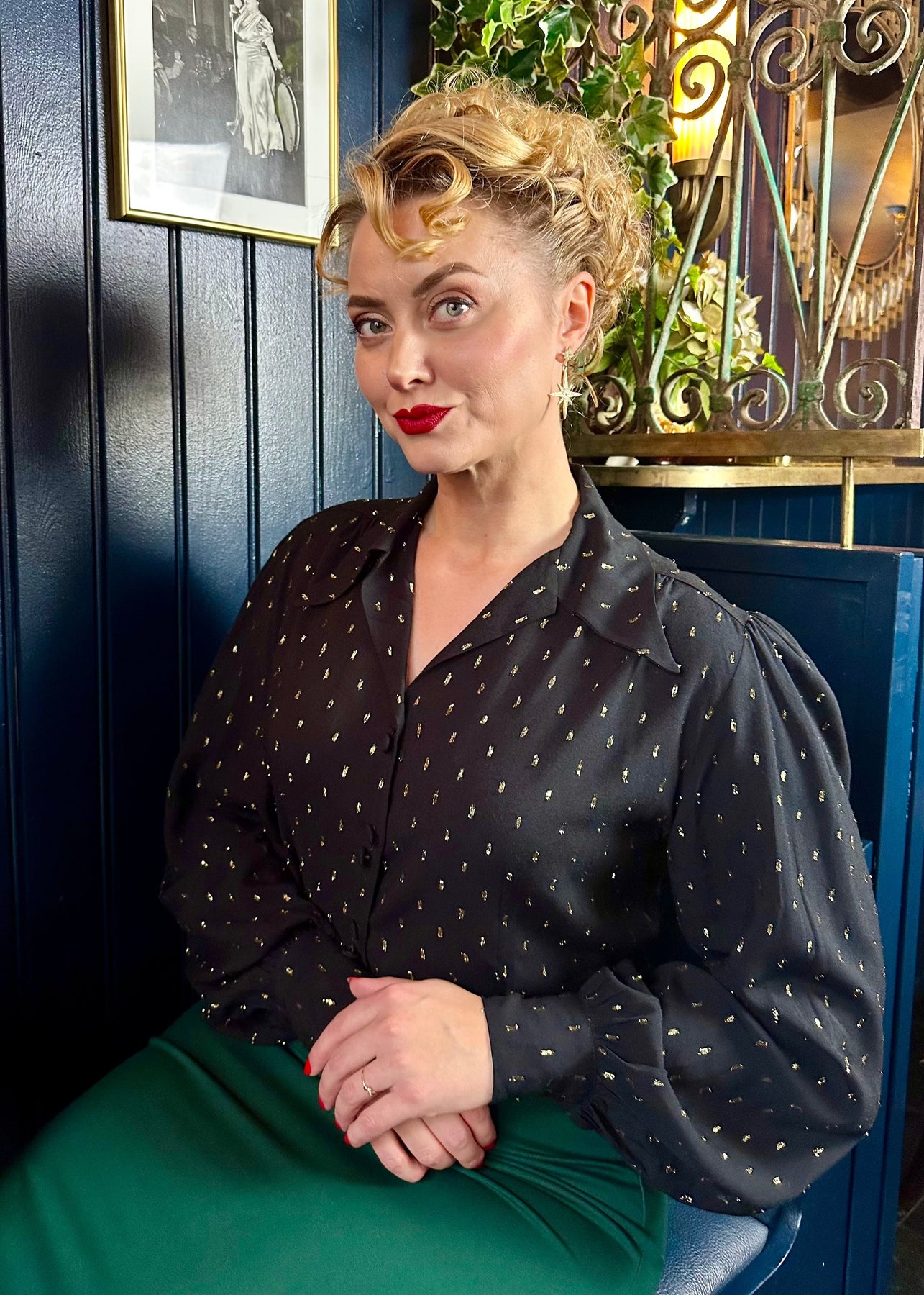 Denna underbara skjorta har den karakteristiska vintagestilens spetsiga krage som ligger vackert över axlarna. Puffärmarna övergår i voluminösa bishop sleeves, som avslutas med manchetter nedtill.