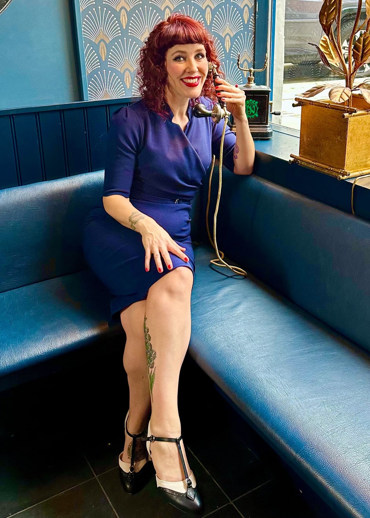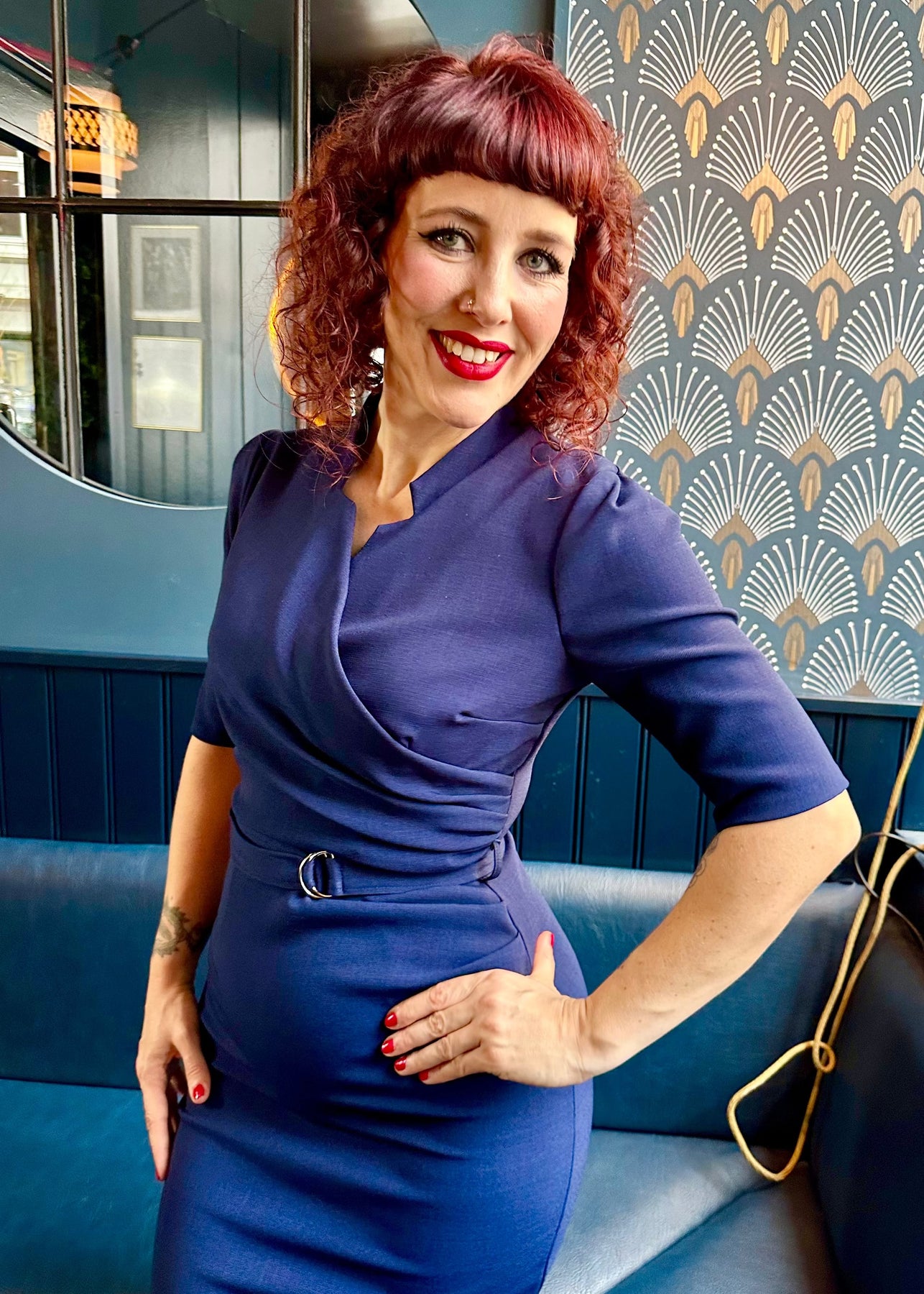 Klänningen har en smickrande faux wrap-livdel som vackert framhäver bysten, medan det justerbara D-ringbältet markerar midjan och skapar den ikoniska hourglass-siluetten som är så typisk för vintage-stilen.