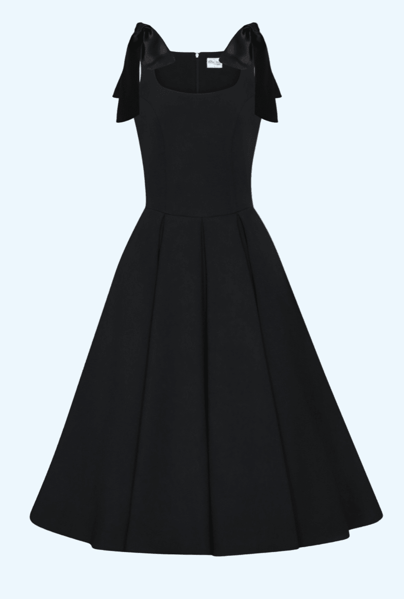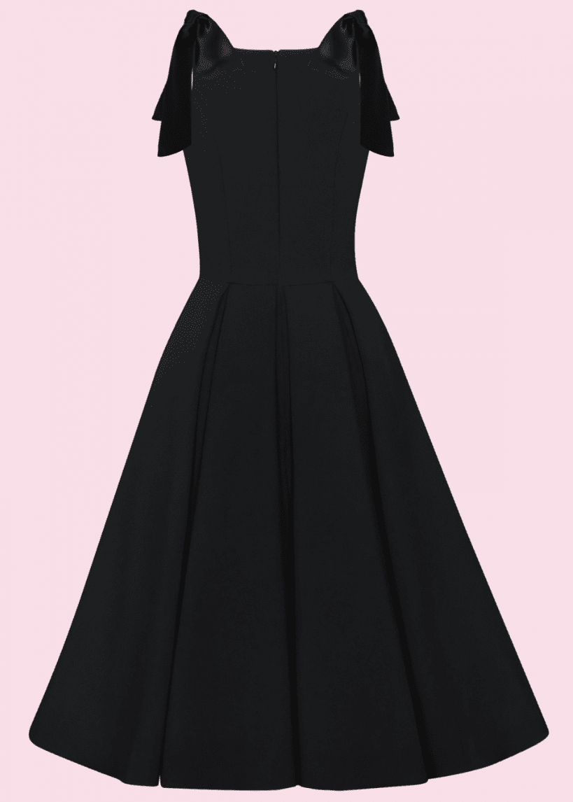 Den svarta färgen gör Josephine enkel att styla – bär den med klackar och rött läppstift för en dramatisk look, eller med flats och kofta för en chic vardagsstil. Ta bort satinslöjorna för ett renare uttryck eller bär klänningen över en blus för en modern vintage-look.