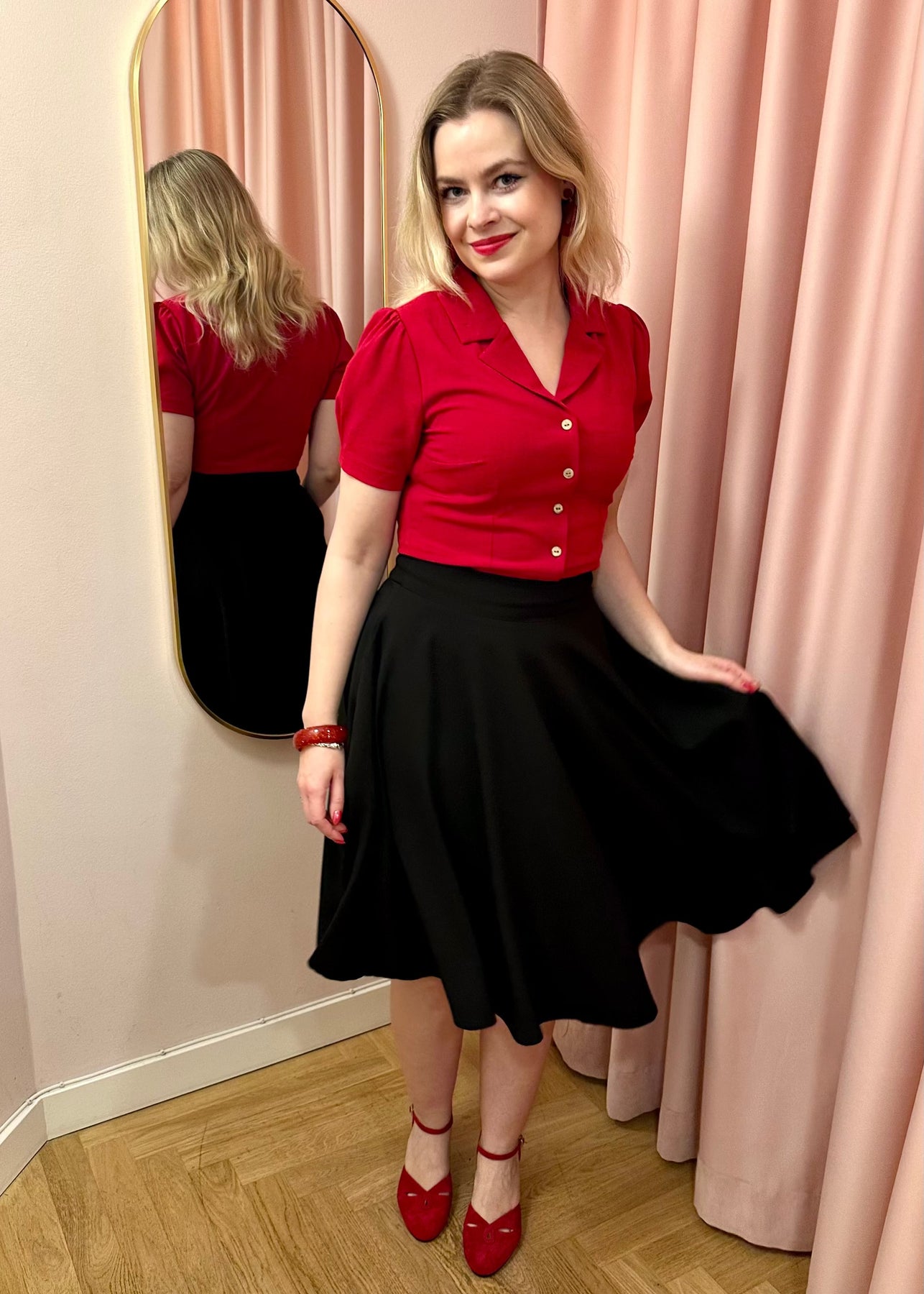 Den klassiska svarta färgen gör kjolen otroligt mångsidig. Styla den med en enkel topp eller blus för vardagsbruk, eller välj en festligare topp och klackar för en elegant retroinspirerad kvällslook. För en komplett vintageoutfit kan du matcha kjolen med den ikoniska Siri-jackan.