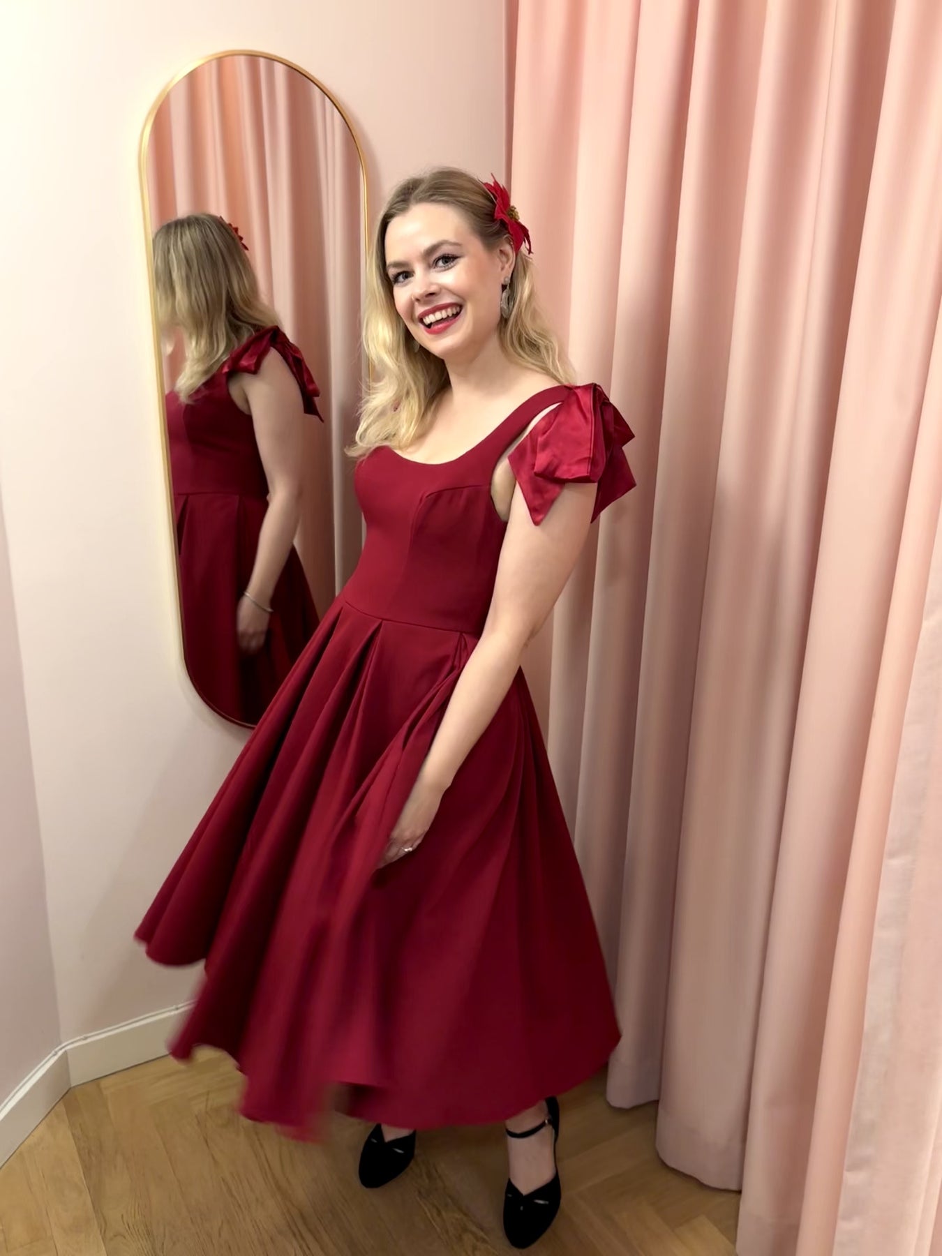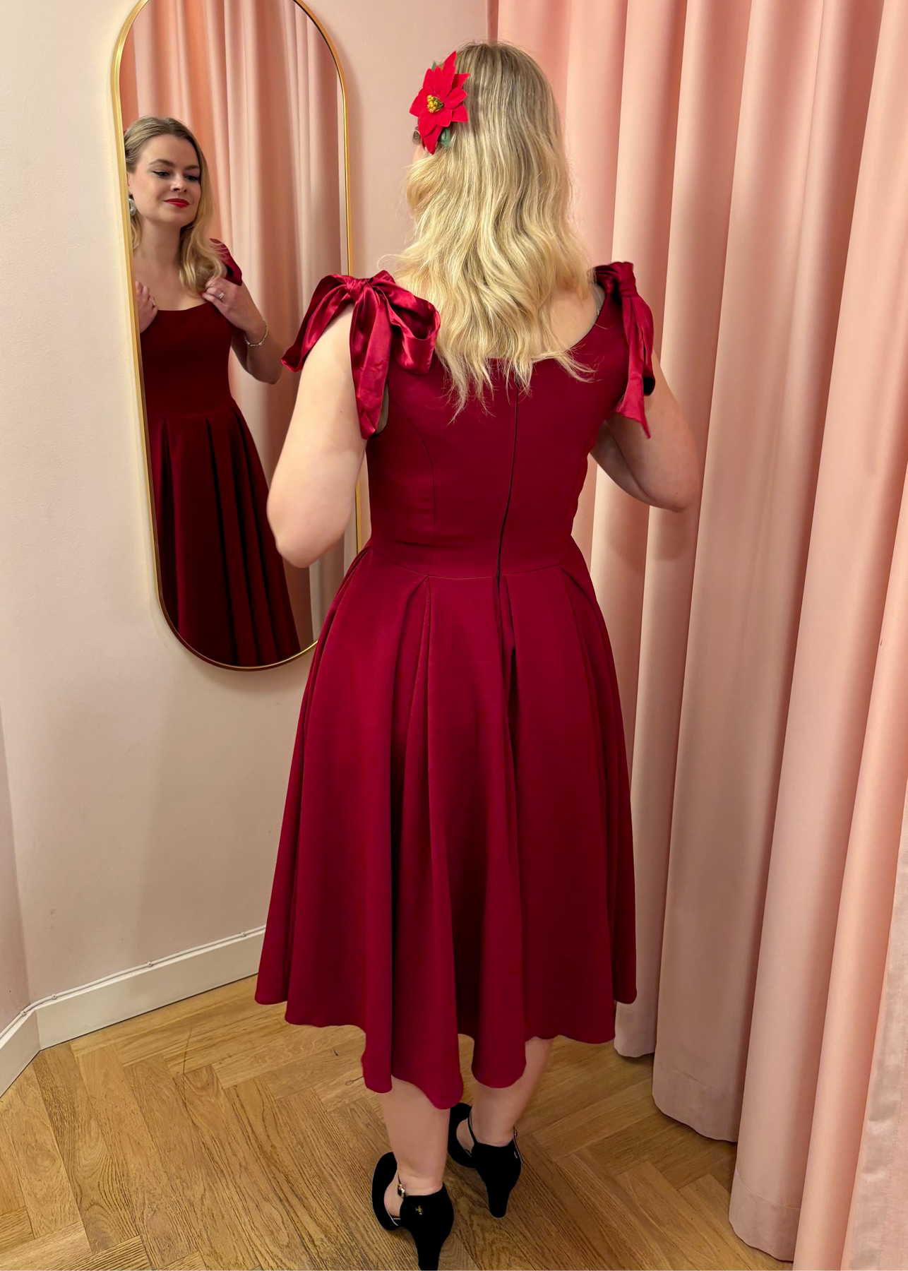 Klänningen har djupa fickor och en dold dragkedja bak, vilket gör den både praktisk och elegant. Den rika bordeaux färgen förstärker den klassiska vintagekänslan och gör stylingen enkel året runt.