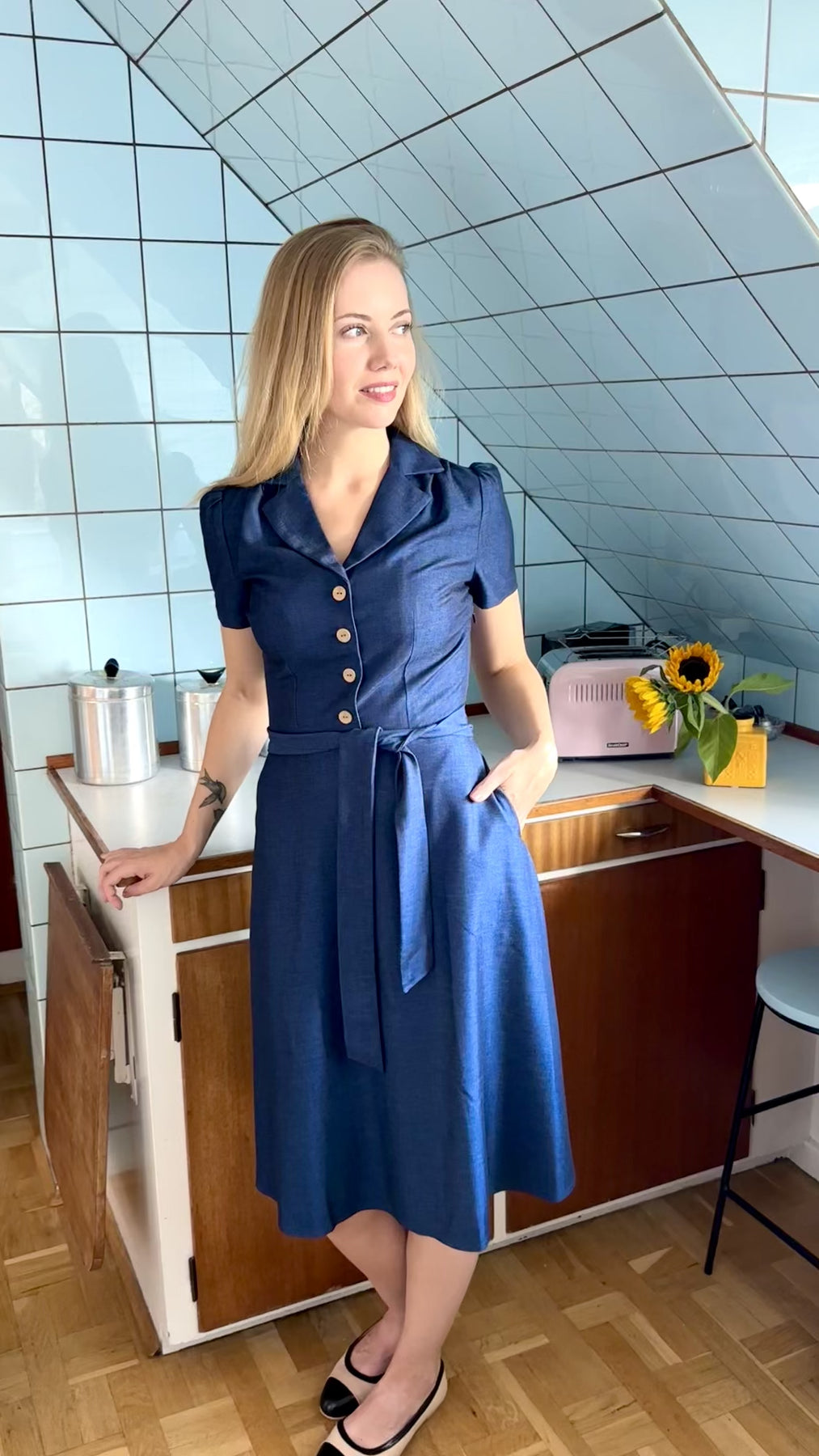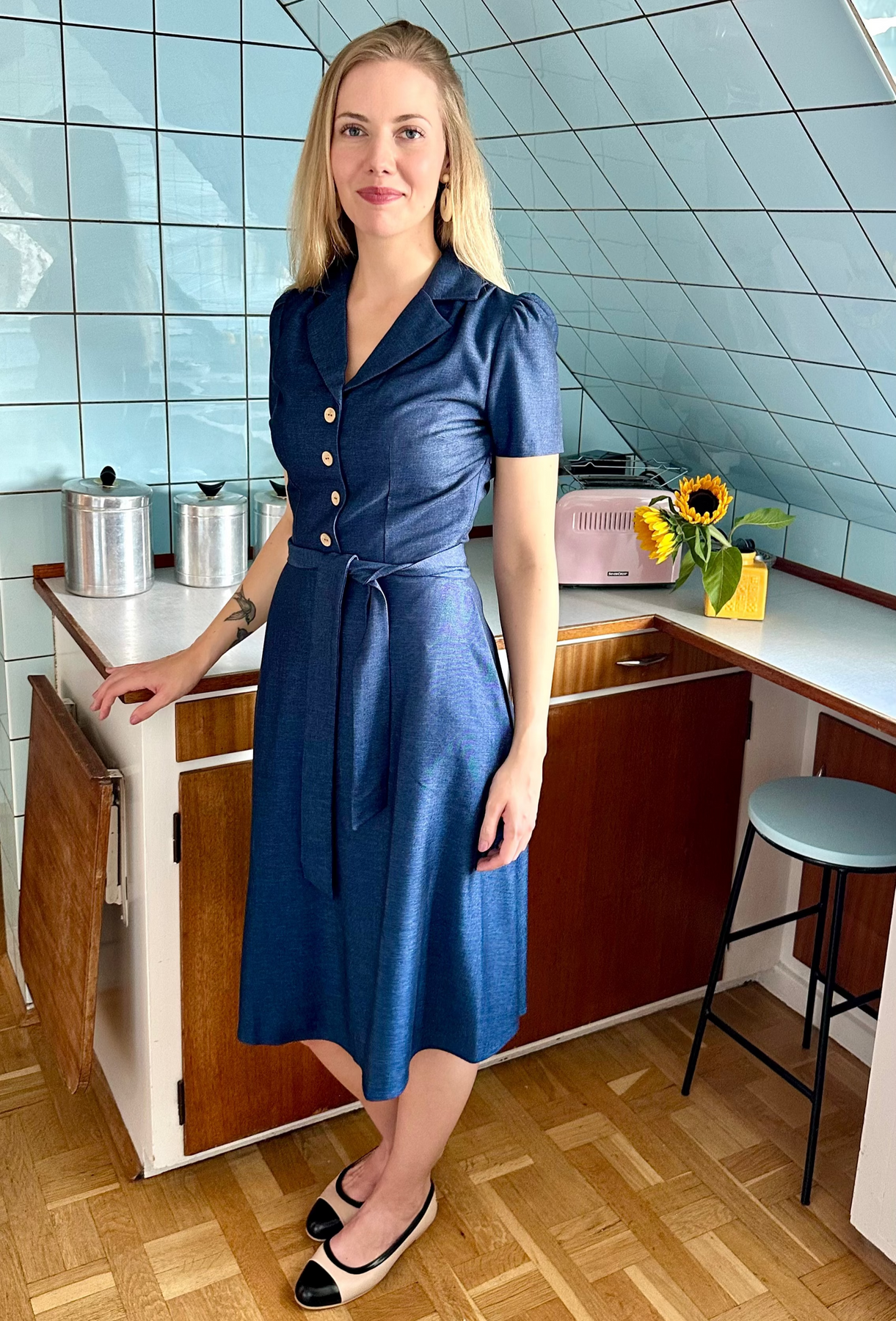Diskret ruching vid axlarna ger det nödvändiga utrymmet ovanför bysten, medan knytbältet framhäver midjan och skapar den klassiska vintagestilens timglassilhuett.