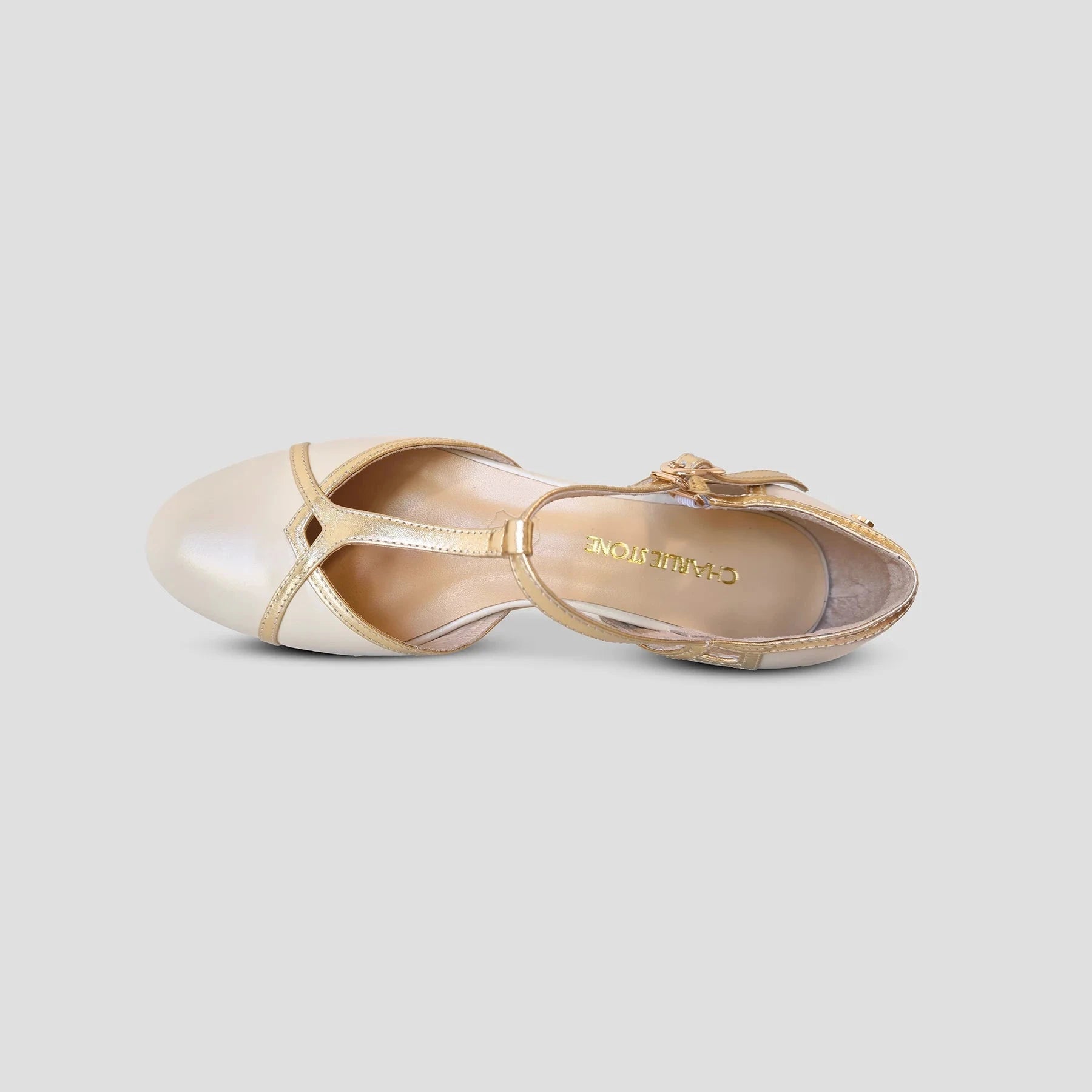 Den vackra kombinationen av pärlemorskimrande offwhite och guld ger skon dess eleganta och festliga utseende, medan den platta Charlie Stone-klacken gör skon superbekväm att bära.