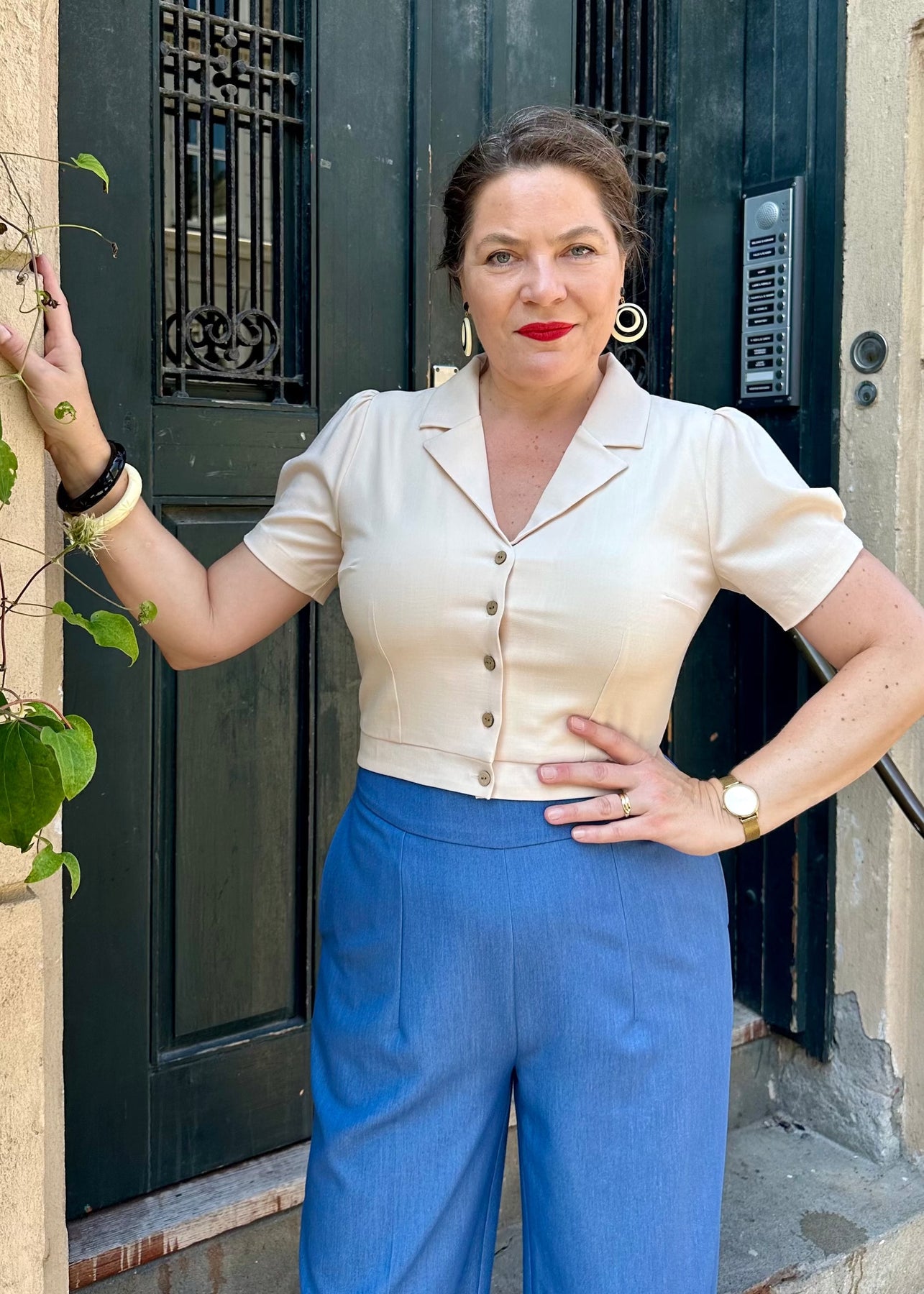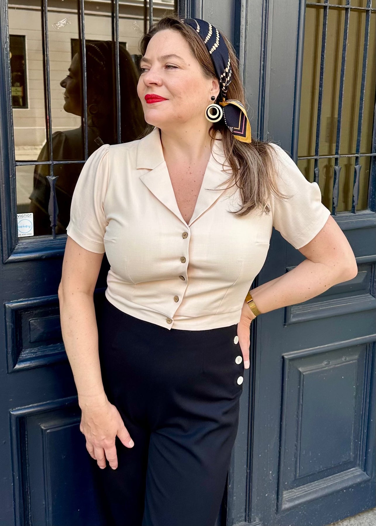 Skjortan stängs med fem små kokosnötsknappar och avslutas med ett fast band nedtill. Den fina croppade looken och den figursydda formen framhäver midjan i sann vintagestil.
