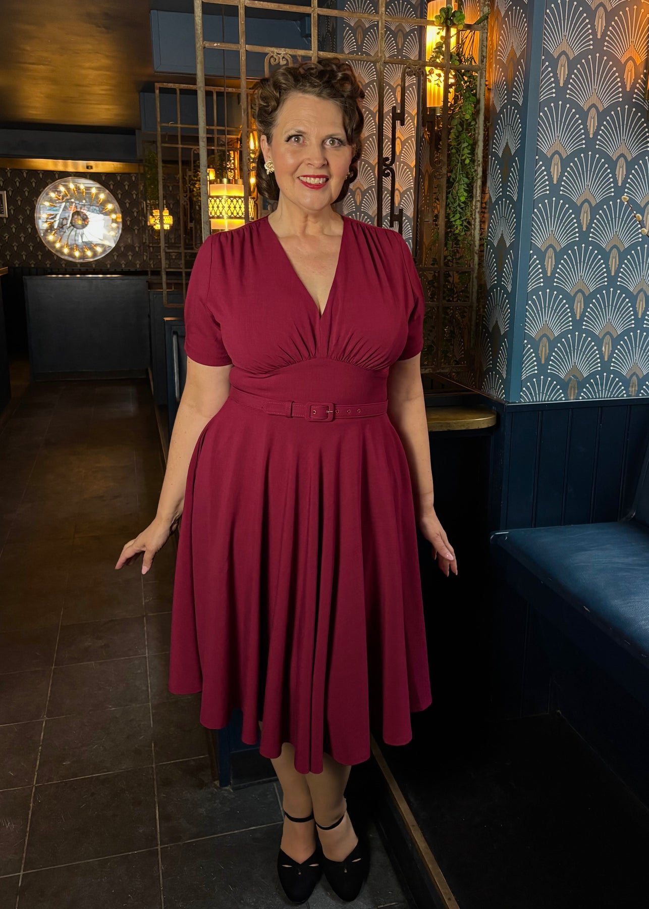 Marilyn-klänningen fokuserar på timglasfiguren, som framhävs av en bred midja och tillhörande bälte. Den har en smickrande v-ringning och under bysten finns en fin drapering som ger en bra passform och en riktigt vacker och smickrande look.