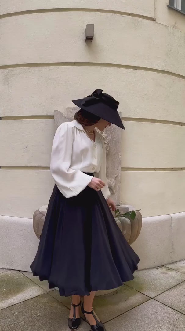 Den har långa, lite fylliga ärmar med klassiska muddar, de små autentiska axelkuddarna ger det lätta tyget ett vackert fall nerför bysten.