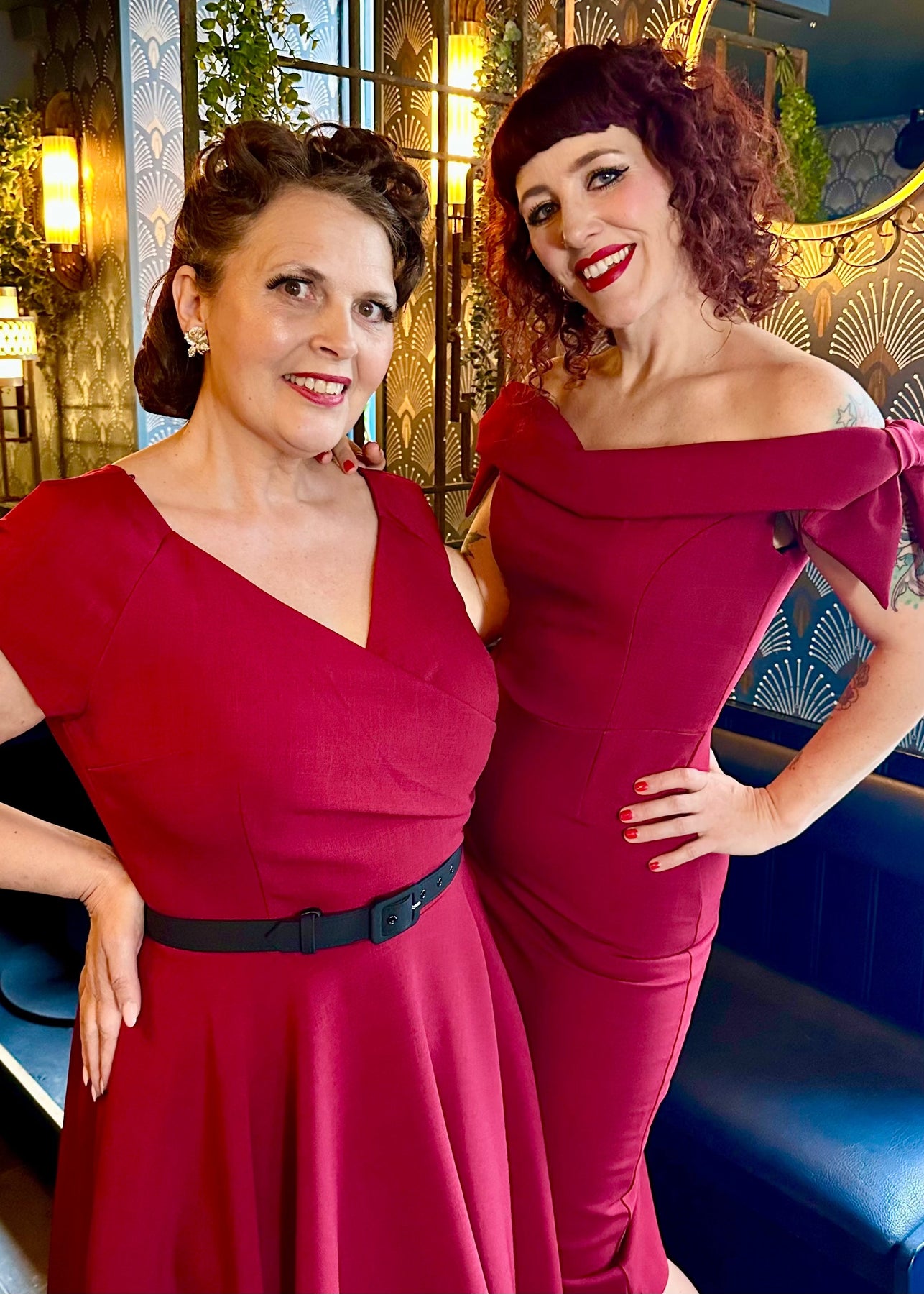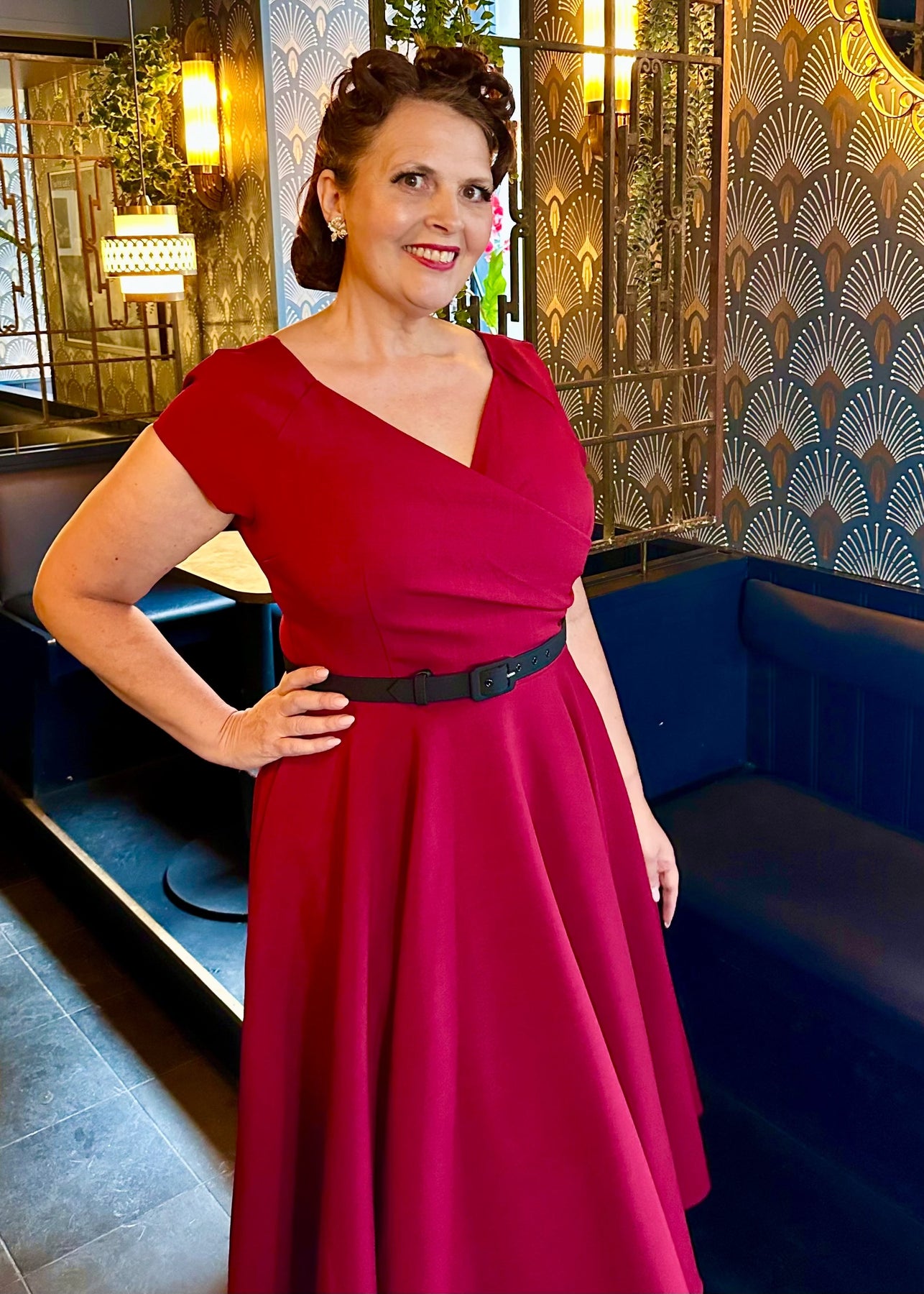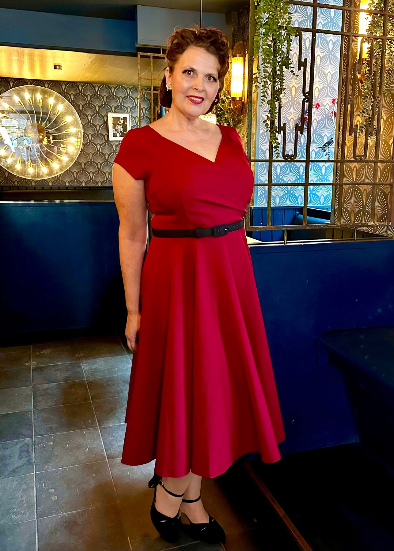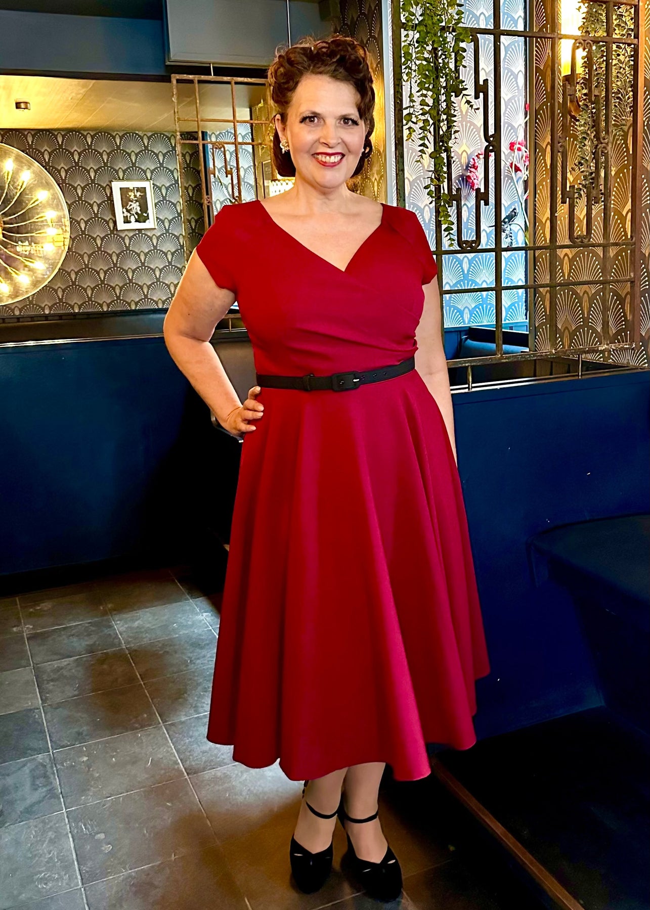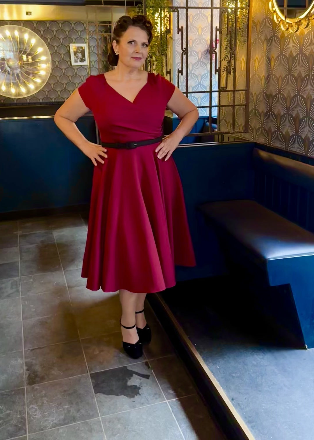 Den vackraste vintage swingklänningen med helsvingad kjol och v-ringning i djup vinröd
