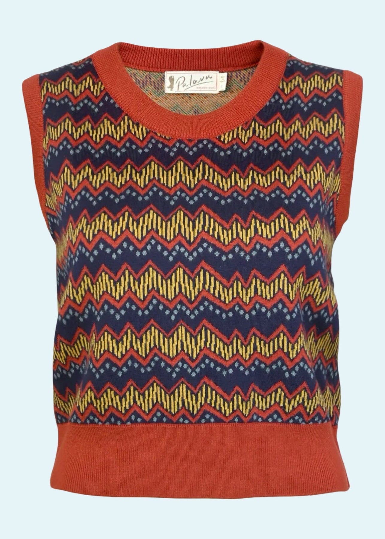 Stickad väst med zigzag-mönster i höstens varma toner från Palava