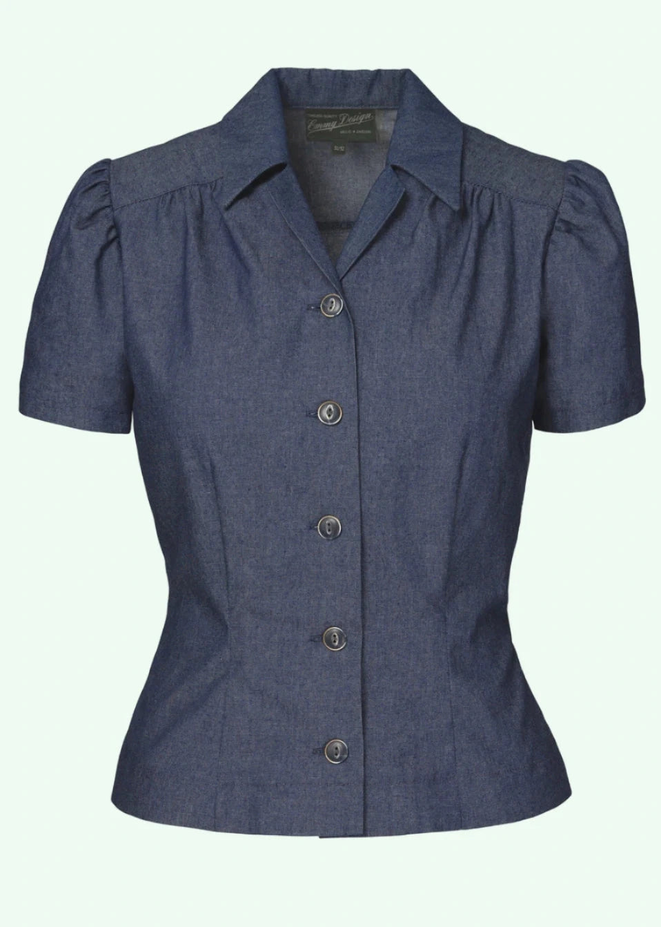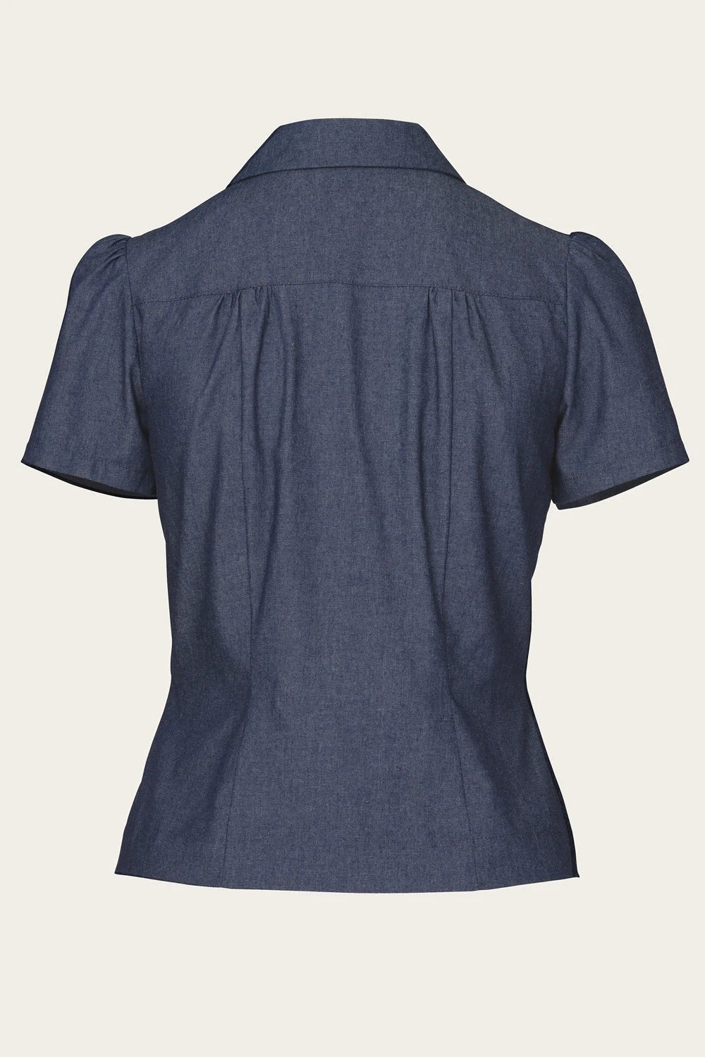 1940'er stils kortærmet skjorte i mørkeblå denim fra Emmy Design.