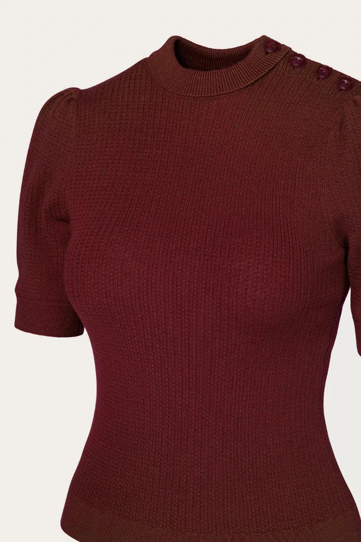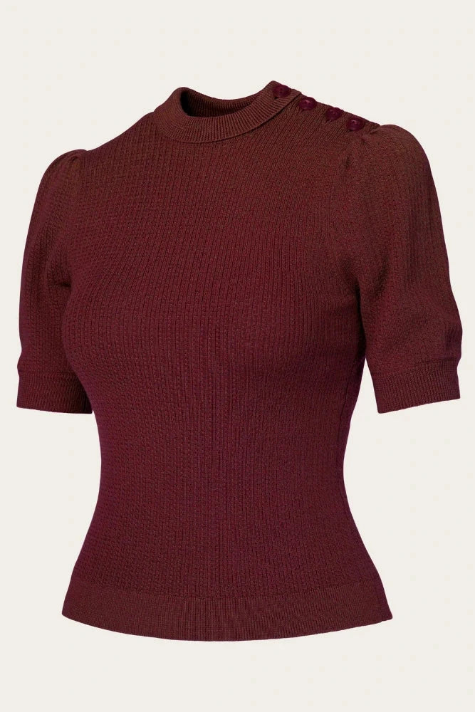 Kortärmad stickad vintagetopp med puffärmar och knappar på axeln.